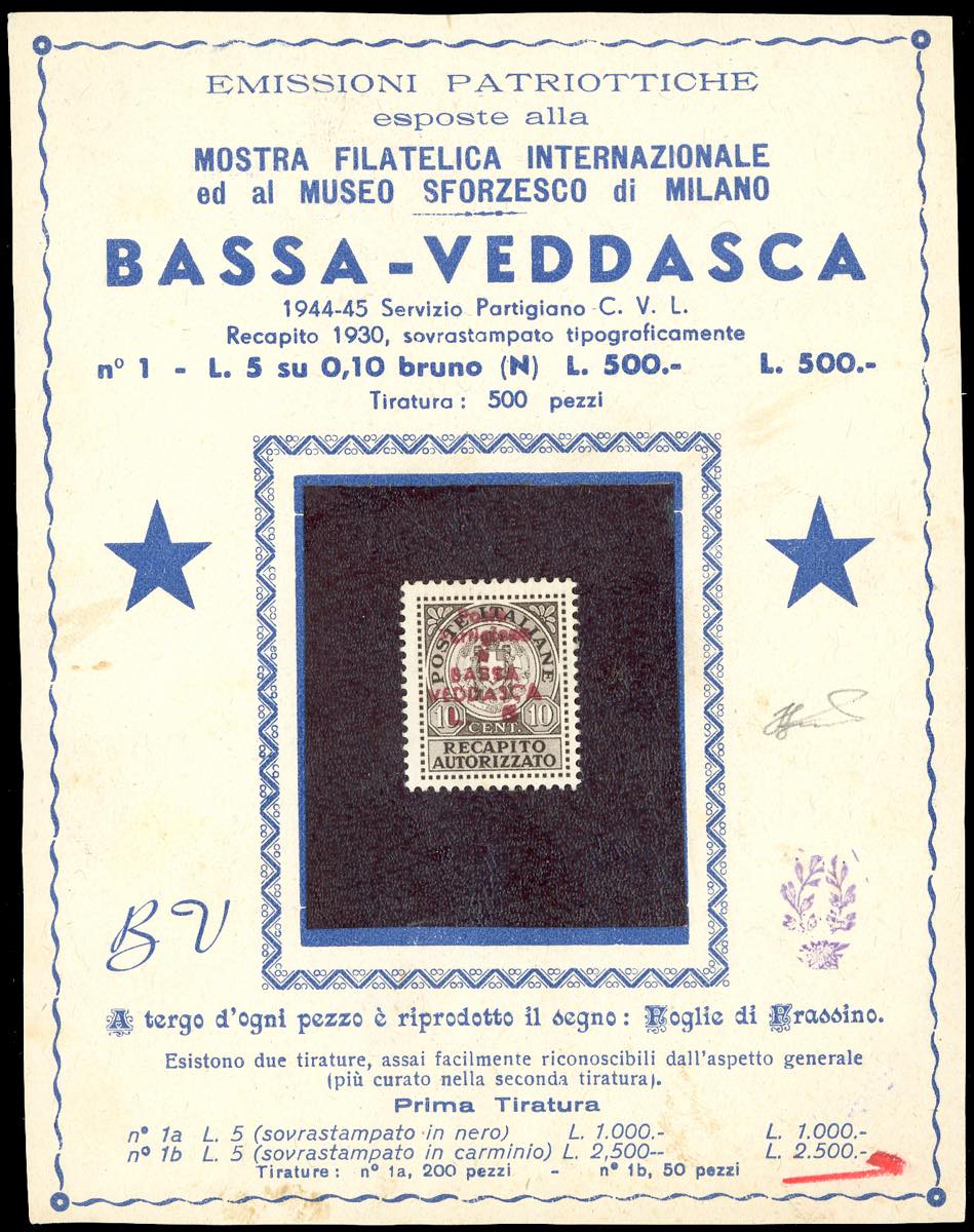 BASSA VEDDASCA 1944/45 - 10 cent. recapito autorizzato, soprastampa in carminio a mano, emissione semidocumentata (Orlandini n.1b), nuovo, perfetto, applicato su cartoncino speciale. Raro, tiratura 50 esemplari. Soprastampa originale dell'epoca. Ferrario.
