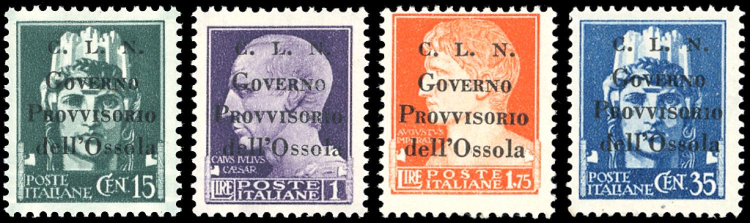 DOMODOSSOLA-VAL D'OSSOLA 1944 - Quattro valori Imperiale soprastampati "C.L.N.Governo Provvisorio dell'Ossola" a titolo di prova (Orlandini n.20,25,26, mentre il 35 cent. risulta non catalogato), nuovi, gomma originale integra, perfetti. Rari. Soprastampe originali dell'epoca, allegato talloncino di Maurizio Raybaudi.