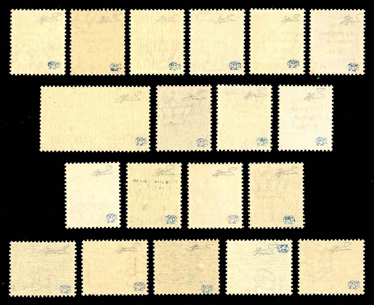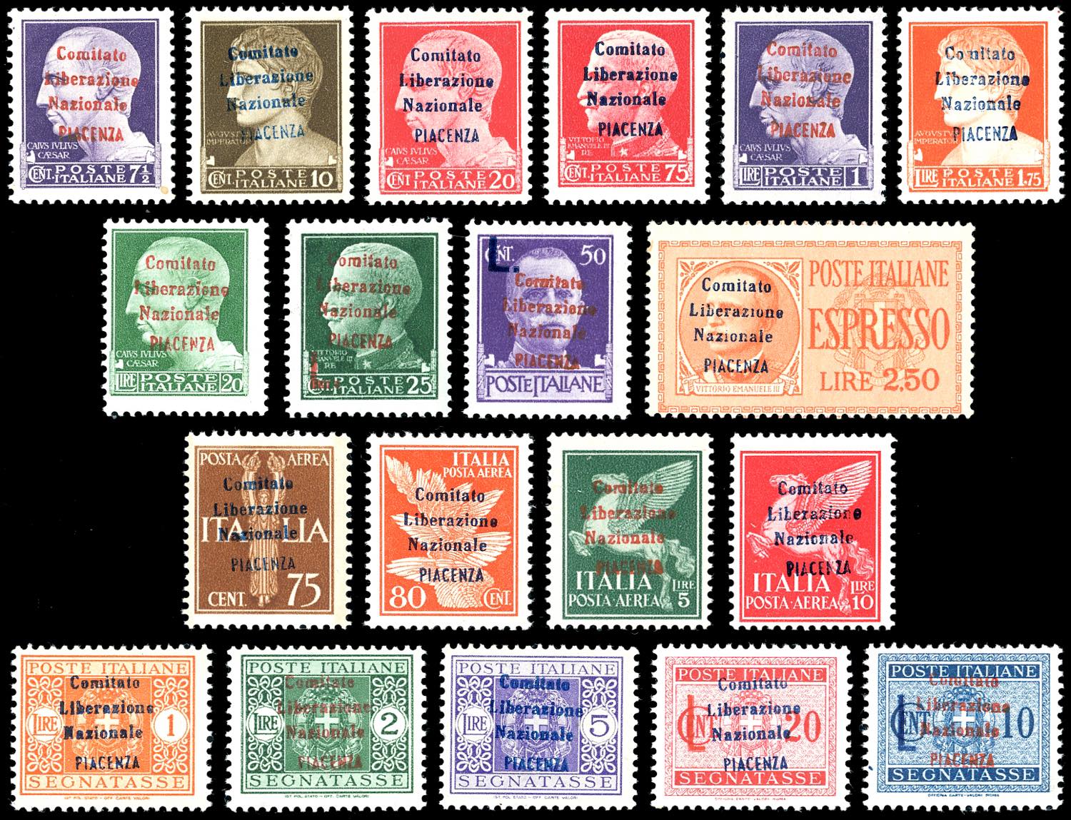 PIACENZA 1945 - Soprastampati "Comitato Liberazione Nazionale Piacenza", serie completa di posta ordinaria, aerea, espresso e segnatasse (Errani Raybuadi 39/57), nuovi, gomma originale integra, perfetti. Bellissimi. Tiratura 25 esemplari ciascuno, ad eccezione del n. 49 che ebbe una tiratura di 125. Insieme di difficilissima reperibilità. Una delle serie più rare di tutti i C.L.N. Cert. Ferrario.