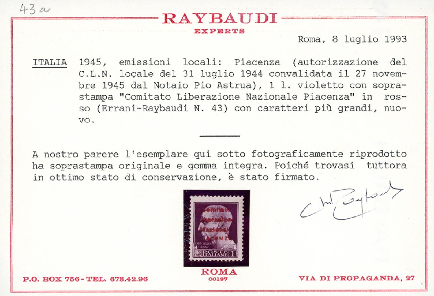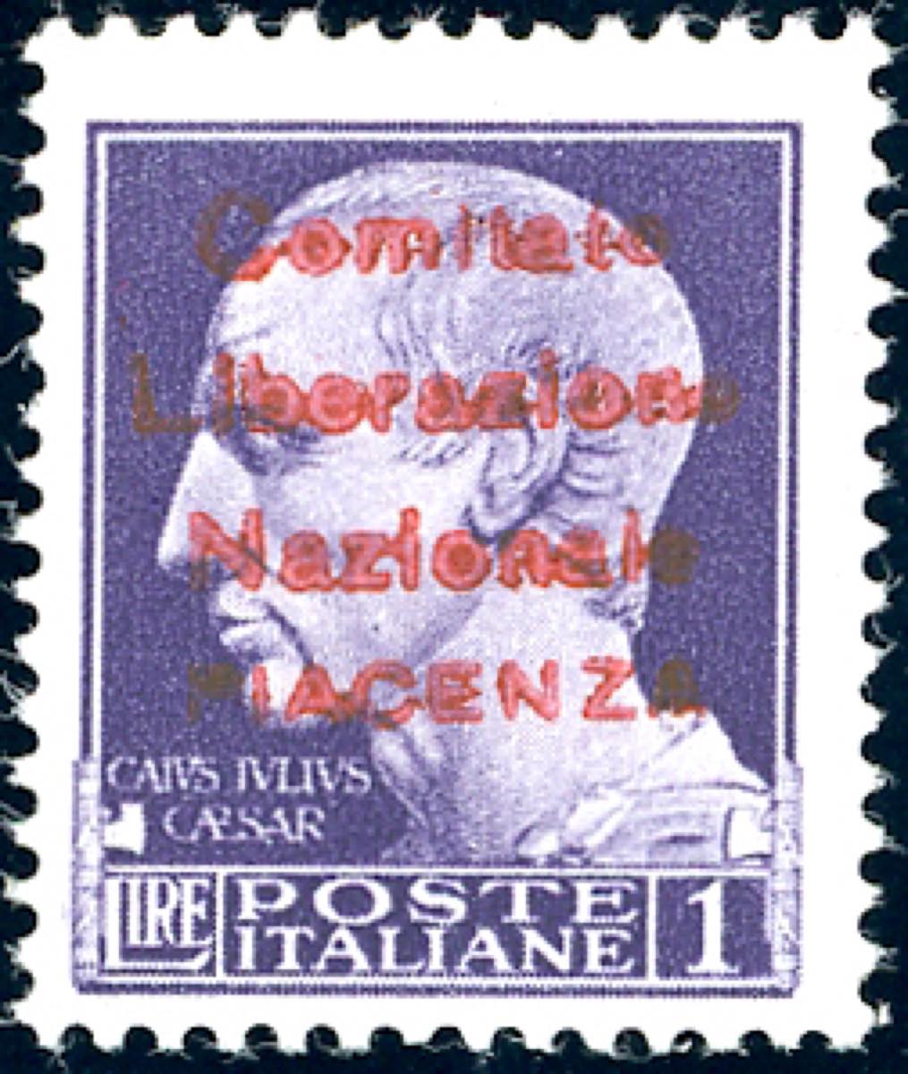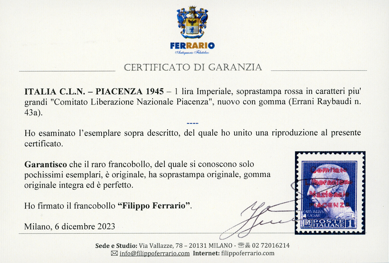 PIACENZA 1945 - 1 lira Imperiale, soprastampa ROSSA IN CARATTERI PIU' GRANDI "Comitato Liberazione Nazionale Piacenza" (Errani Raybaudi 43a), nuovi, gomma originale integra, perfetto. Molto bello. Francobollo estremamente raro di cui si conoscono solo pochi esemplari. Cert. Ferrario e Raybaudi.