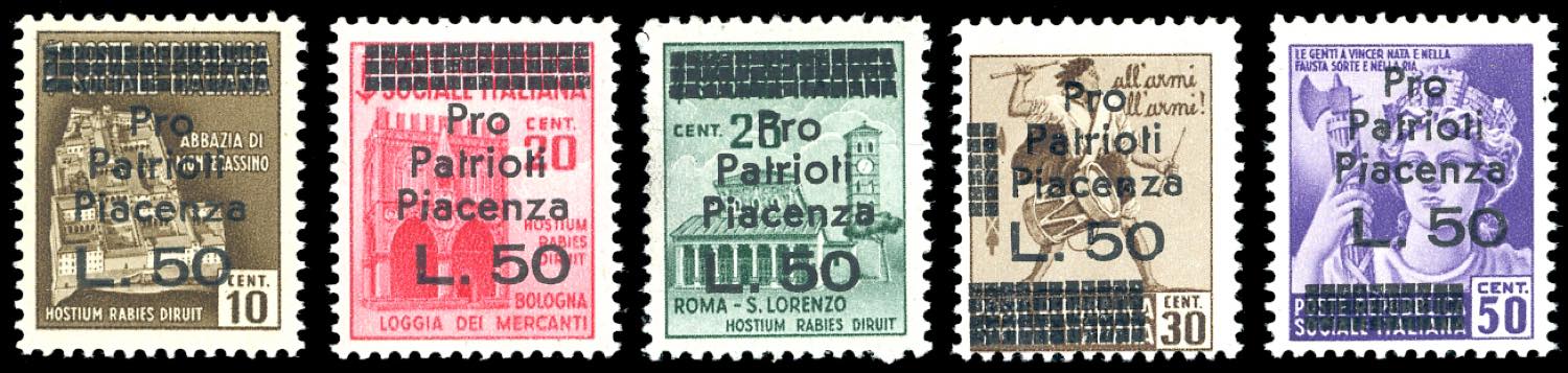 PIACENZA 1945 - Monumenti Distrutti, serie completa, soprastampati "Pro Patrioti Piacenza L.50" (Errani Raybaudi 89/93,CEI n.1/5 € ... Leggi tutto