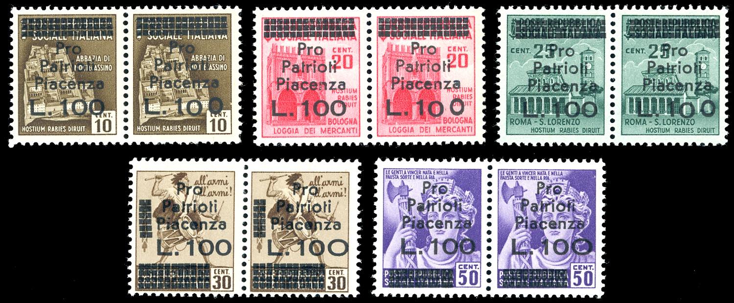 PIACENZA 1945 - Monumenti Distrutti, serie completa in coppie, soprastampati "Pro Patrioti Piacenza L.100", i primi tre valori con il secondo esemplare varietà "0" di "100" spostato in alto a destra, gli altri due con il secondo "0" di "100" più grande e posto orizzontalmente (Errani Raybaudi 94/98+94a,95a,96a,97b,98b), nuove, gomma originale integra, perfette. Insieme raro. Ferrario.