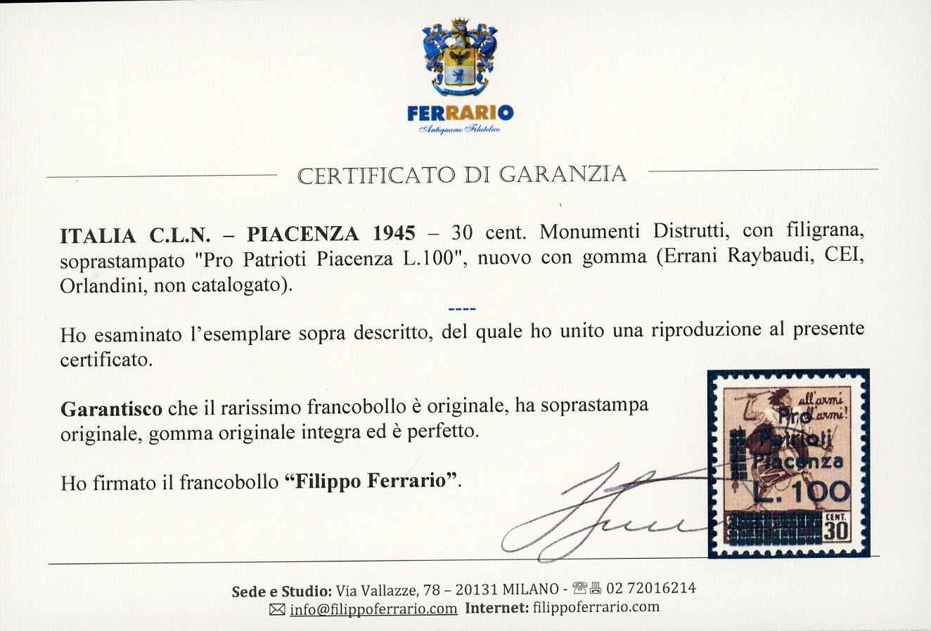 PIACENZA 1945 - 30 cent. Monumenti Distrutti, con filigrana, soprastampato "Pro Patrioti Piacenza L.100" (Errani Raybaudi, CEI, Orlandini non catalogato), nuovo, gomma originale integra, perfetto. Molto bello. Rarissimo e finora non catalogato. Cert. Ferrario e Raybaudi.