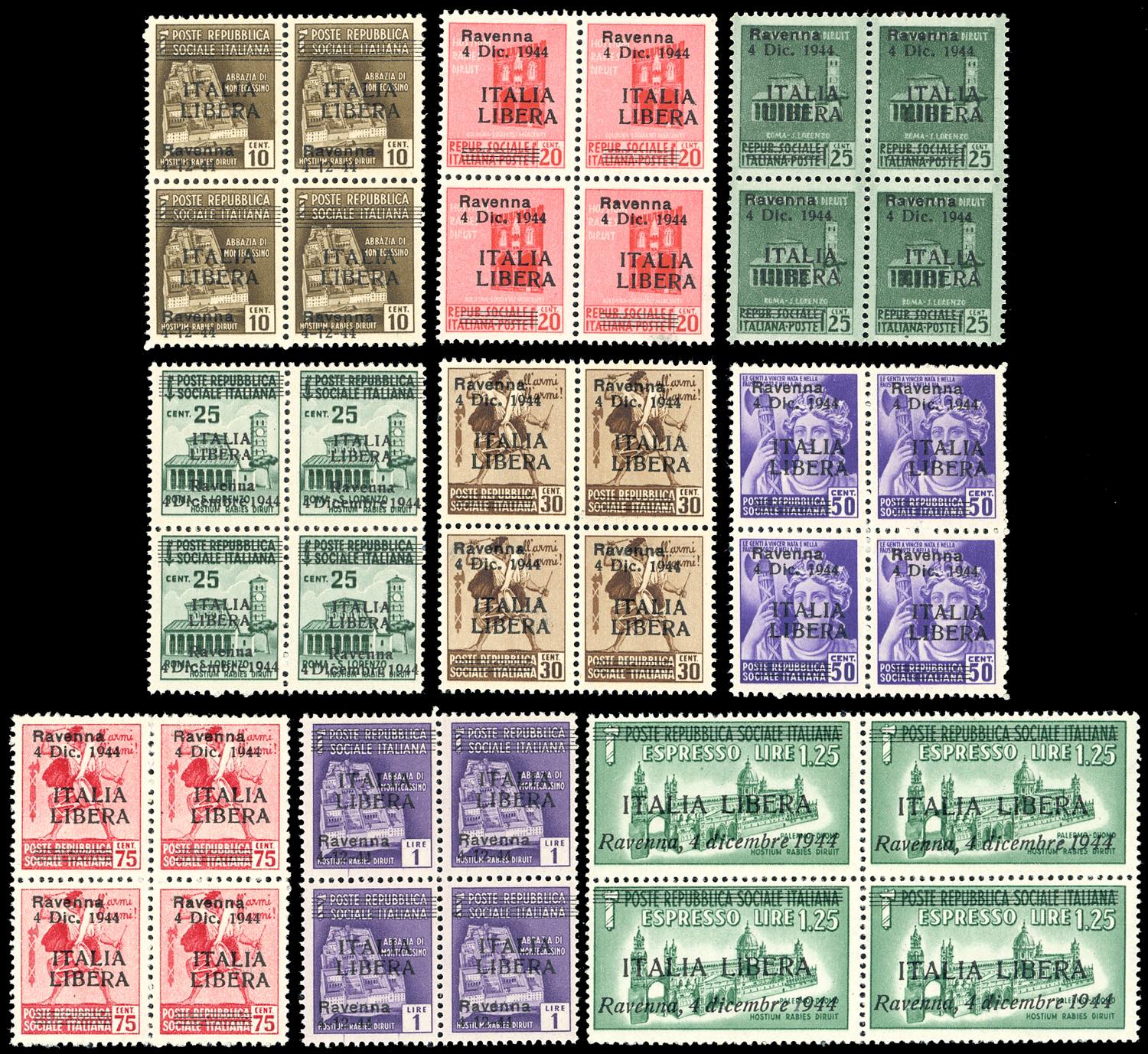 RAVENNA 1945 - Serie completa di 9 valori soprastampati (CEI n.1/9 € 24.000 a serie, Orlandini n. 1/9 pag.60 € 4.500 a serie), blocchi di quattro, nuovi, gomma originale integra, perfetti, molto belli. Insieme raro. Cert. Raybaudi.