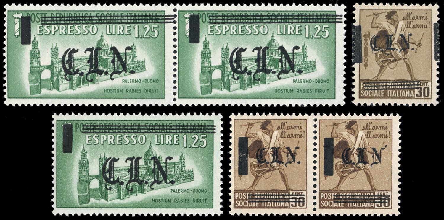 TORINO 1945 - Lotto di sei esemplari soprastampati con varietà, nuovi, gomma originale integra, perfetti. Ottima qualità. Due cert. Raybaudi.