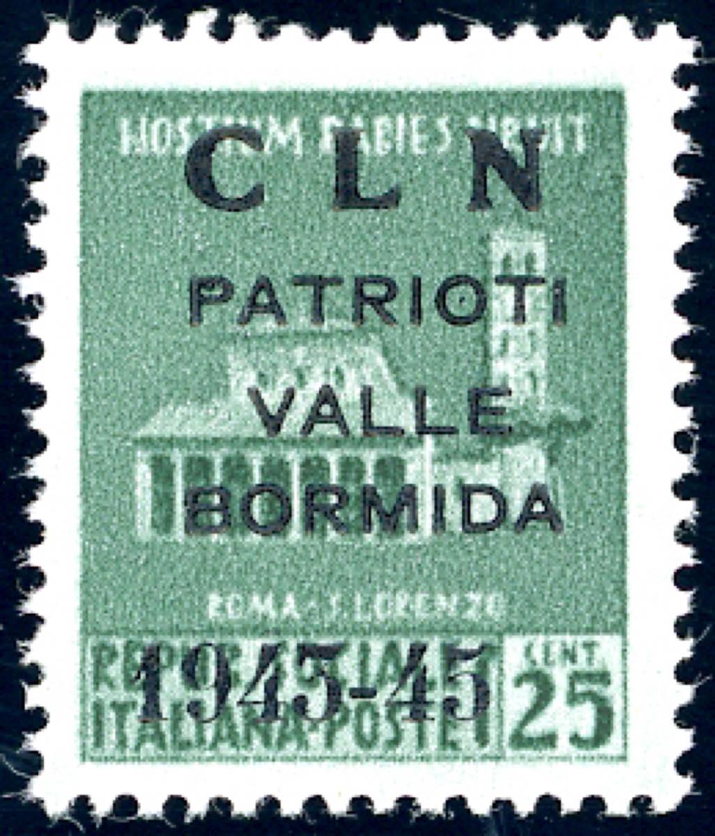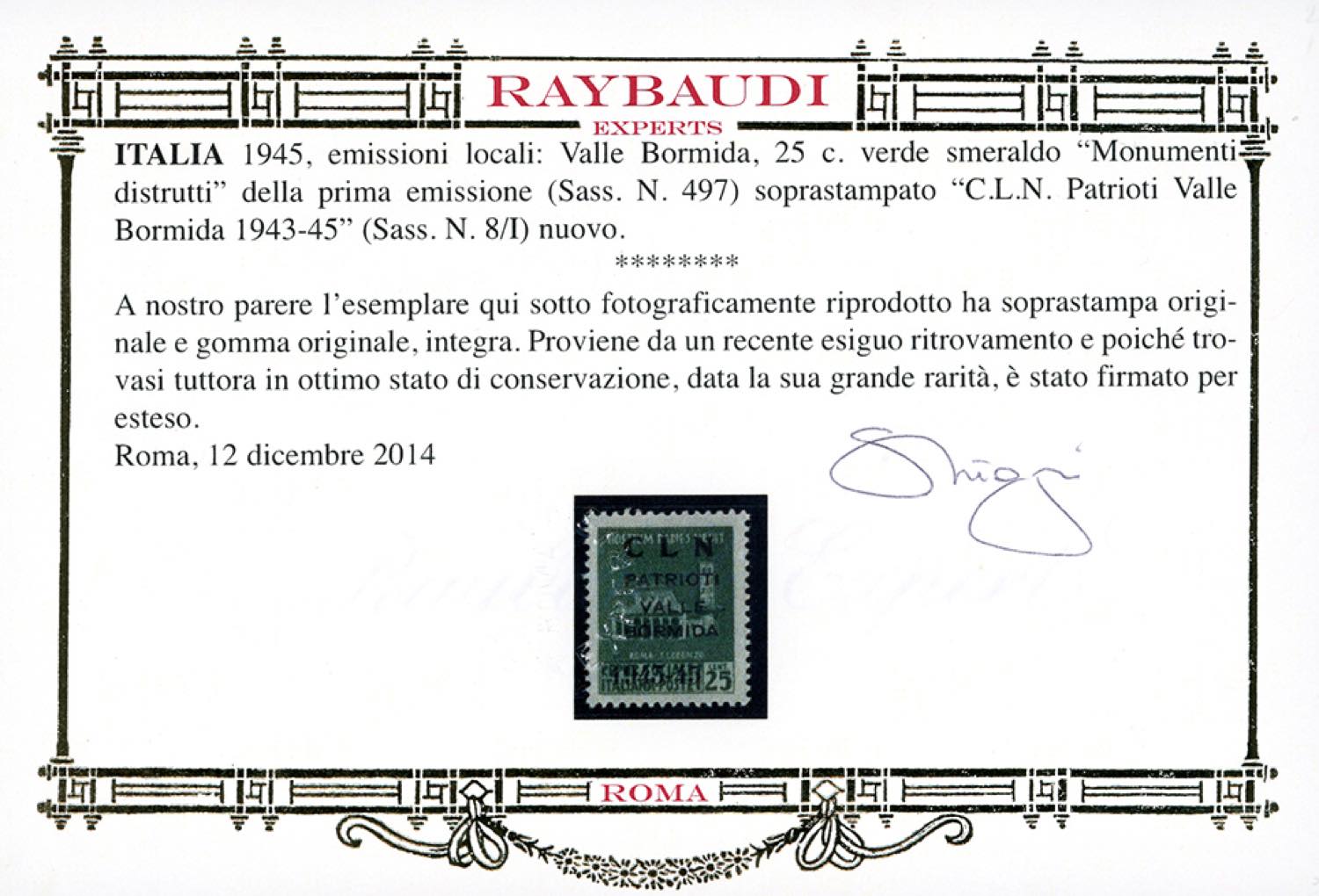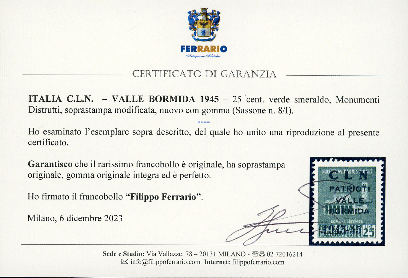 VALLE BORMIDA 1945 - 25 cent. verde smeraldo, Monumenti Distrutti, soprastampa modificata (8/I), nuovo, gomma originale integra, perfetto. Splendido e raro, pochi esistenti. Cert. Oro Raybaudi e Ferrario.