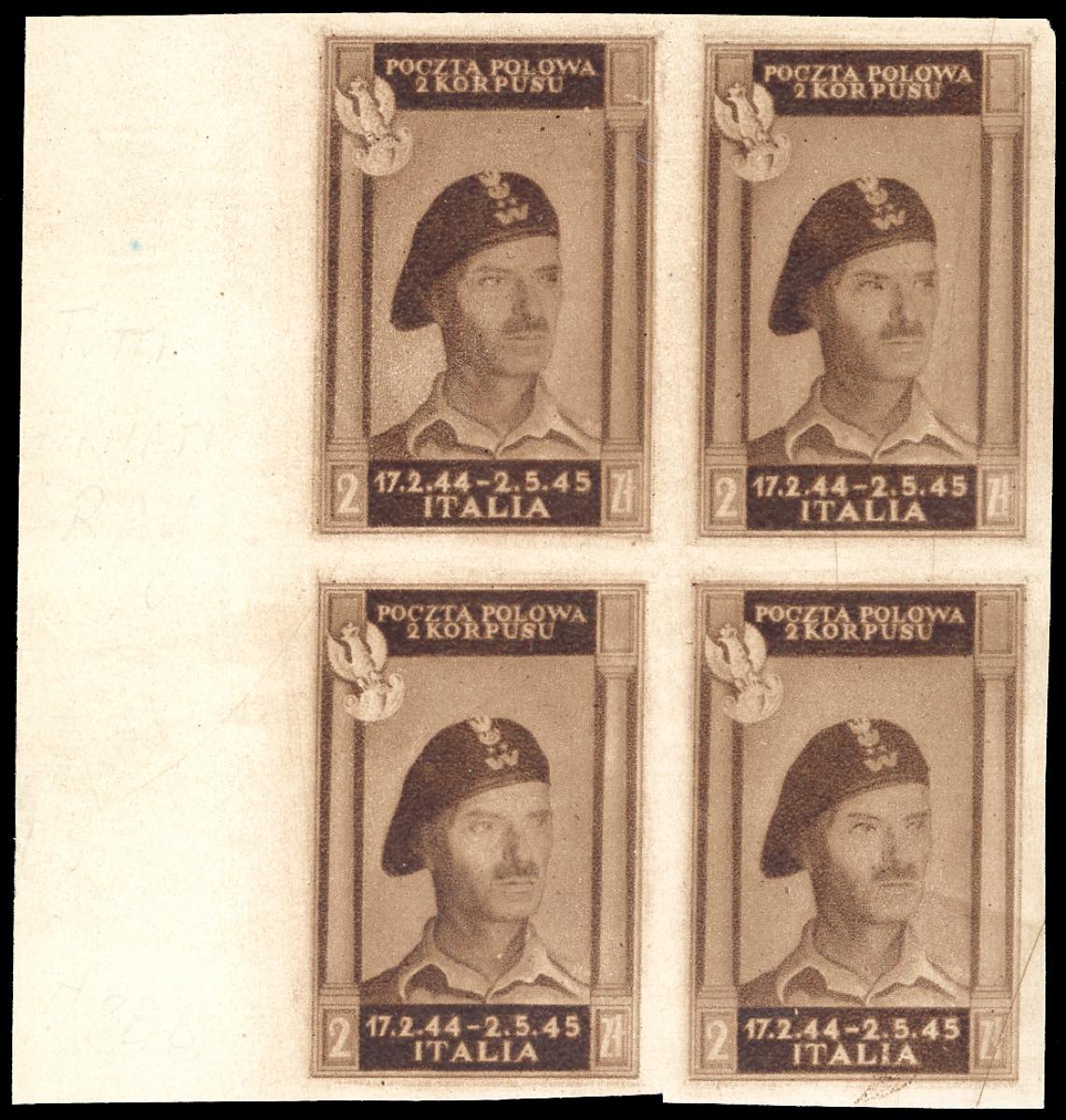 1946 - 2 zl. bruno cioccolato chiaro, non dentellato (8Bb), blocco di quattro, bordo di foglio, senza gomma come sempre, perfetto. Molto bello. Cert. Ferrario.