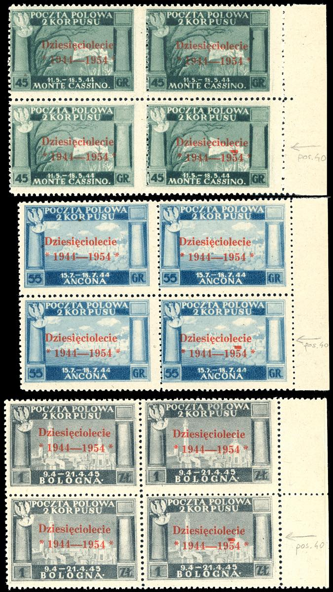 GOVERNO DI LONDRA 1954 - Serie completa, soprastampa vermiglio, blocchi di quattro, bordo di foglio, con un esemplare con varietà tratto tipografico sopra il 5 di 1954 (7/9,7ba/9ba), nuovi, gomma originale integra, perfetti. Belli e molto rari. Cert. Ferrario.