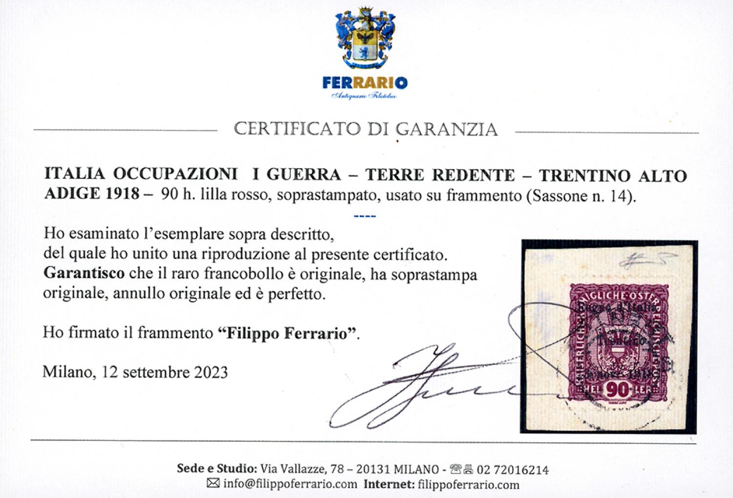 TRENTINO ALTO ADIGE 1918 - 90 h. soprastampato (14), perfetto, usato su frammento. Raro. Cert. Ferrario.