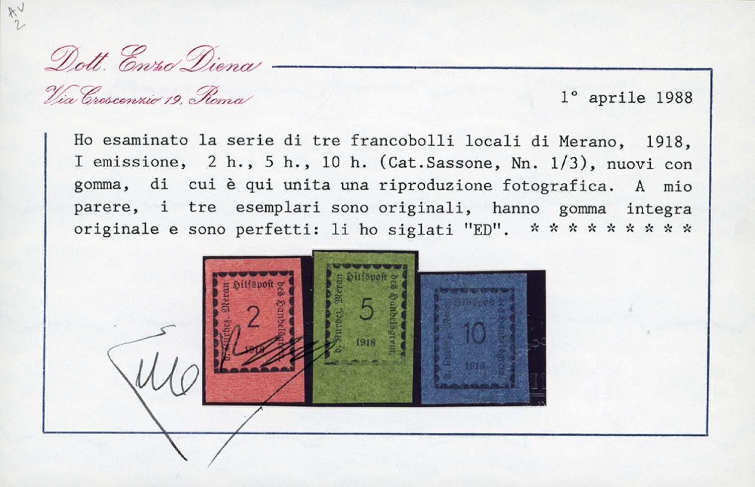 MERANO 1918 - Prima emissione, serie completa (1/3), nuovi, gomma originale integra, perfetti. Splendidi e molto freschi. Rari. Cert. Enzo Diena.