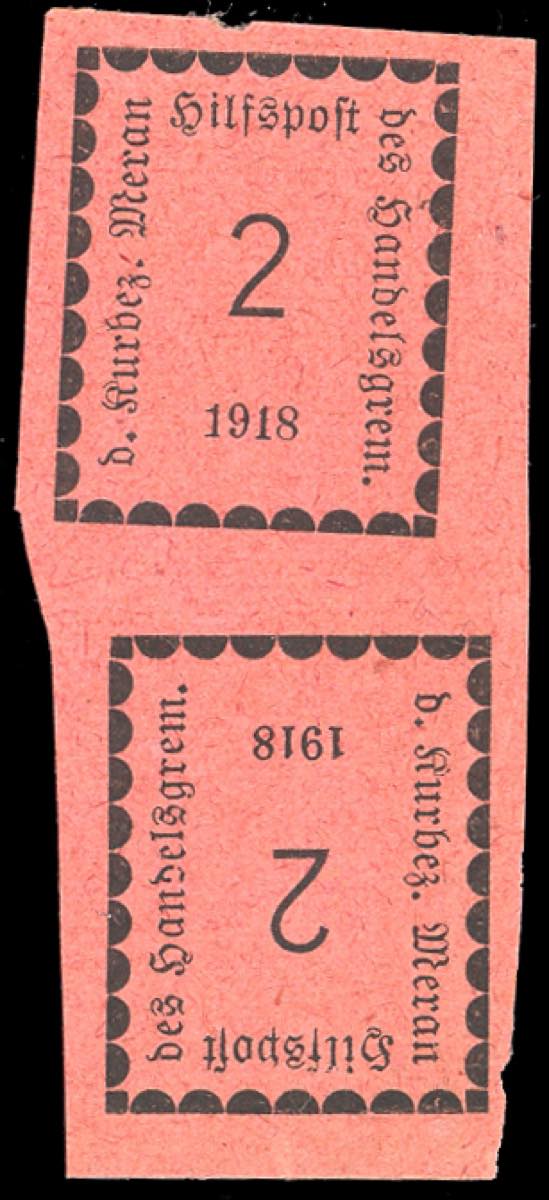 Lotto 1669 - MERANO 1918 - 2 h. rosa coppia verticale tète-bèche (1c), ...