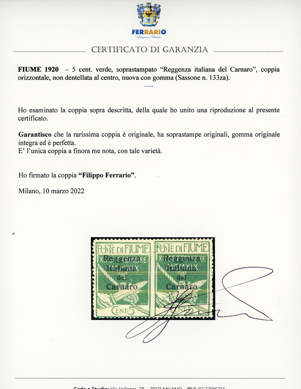 FIUME 1920 - 5 cent. soprastampato "Reggenza Italiana", coppia orizzontale non dentellata al centro (133za), gomma originale integra, perfetta. UNICA NOTA! A.Diena, cert. Ferrario.
