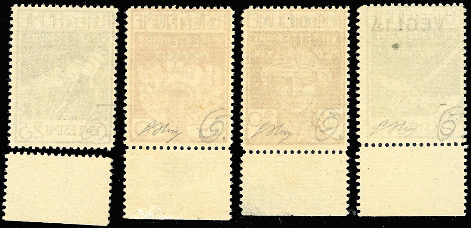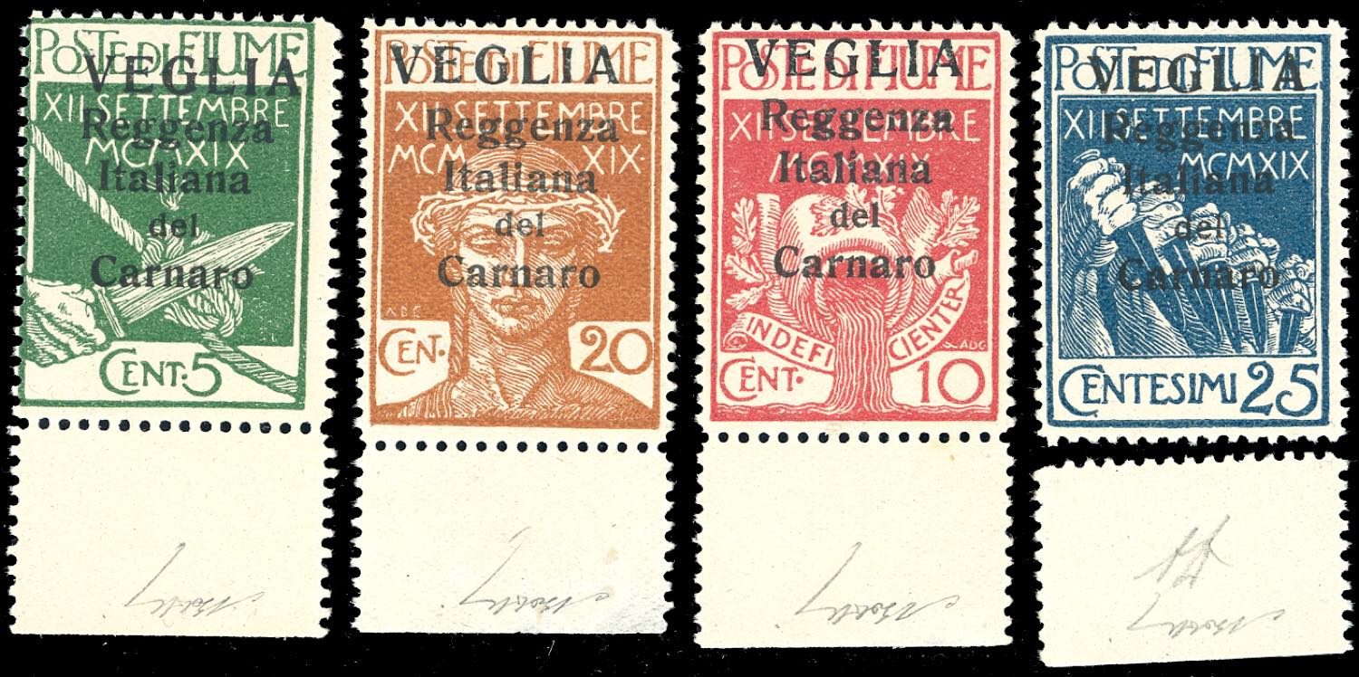 VEGLIA 1920 - Soprastampati in caratteri grandi, serie completa (1\4), gomma originale integra, perfetti. Splendidi, rari di questa qualità. G.Oliva, cert. Finanziario Bolaffi 100%.
