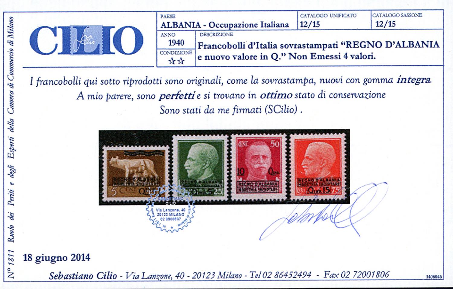 ALBANIA OCCUPAZIONE ITALIANA 1940 - Imperiale soprastampati, non emessi, serie completa (12/15), nuovi, gomma originale integra, perfetti. Molto belli. Ferrario, cert. Cilio.
