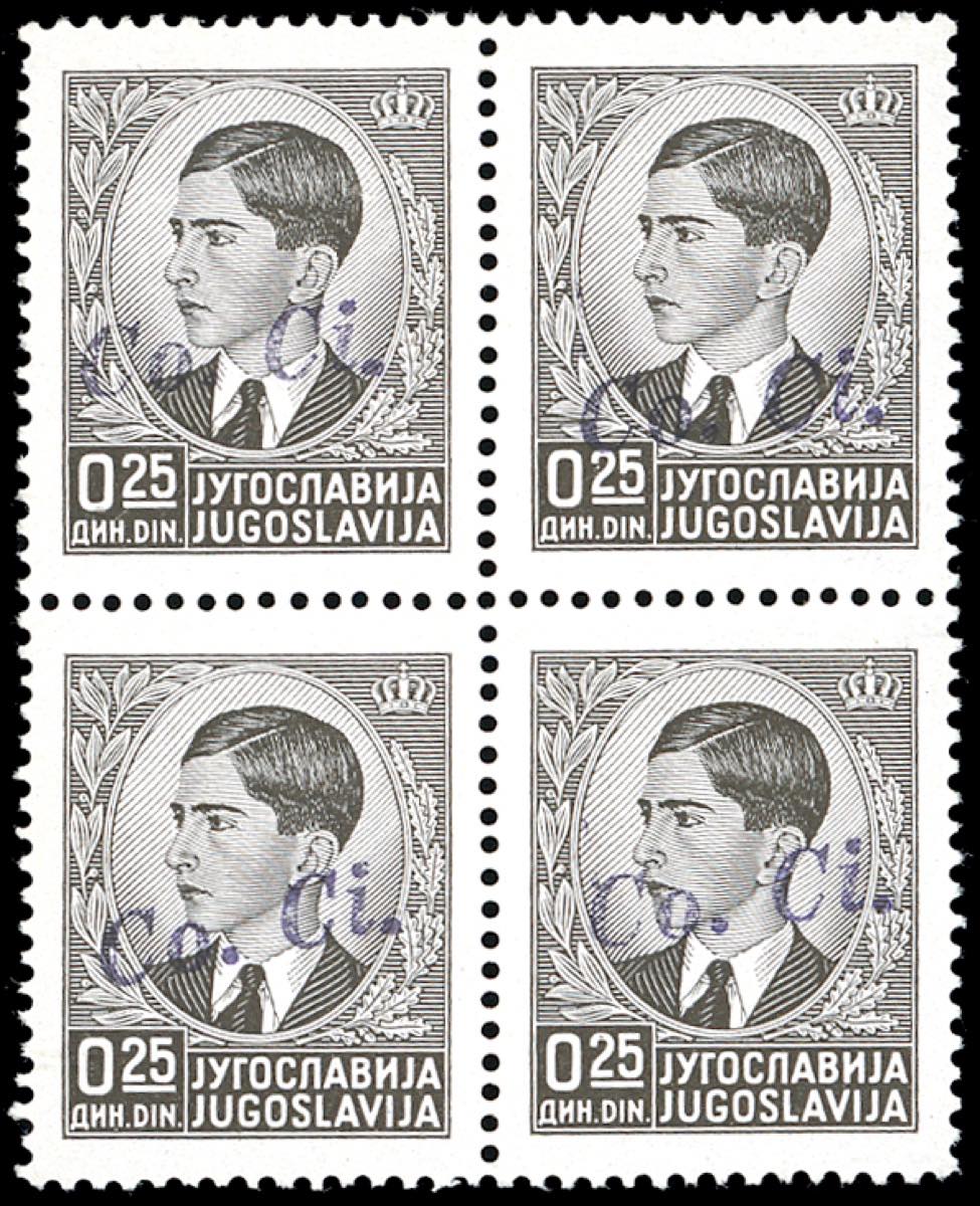 LUBIANA 1941 - 25 p. soprastampa a mano Co.Ci. obliqua (1Bb), blocco di quattro, gomma originale integra, perfetto. J.Bar, Ferrario.