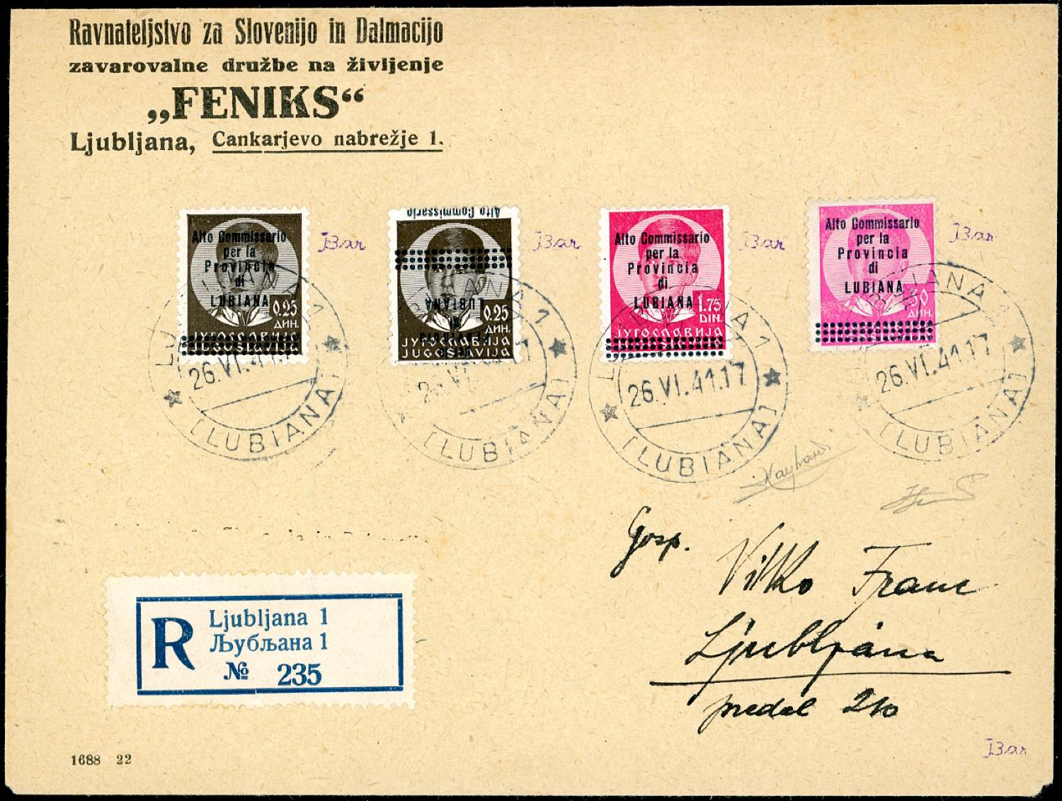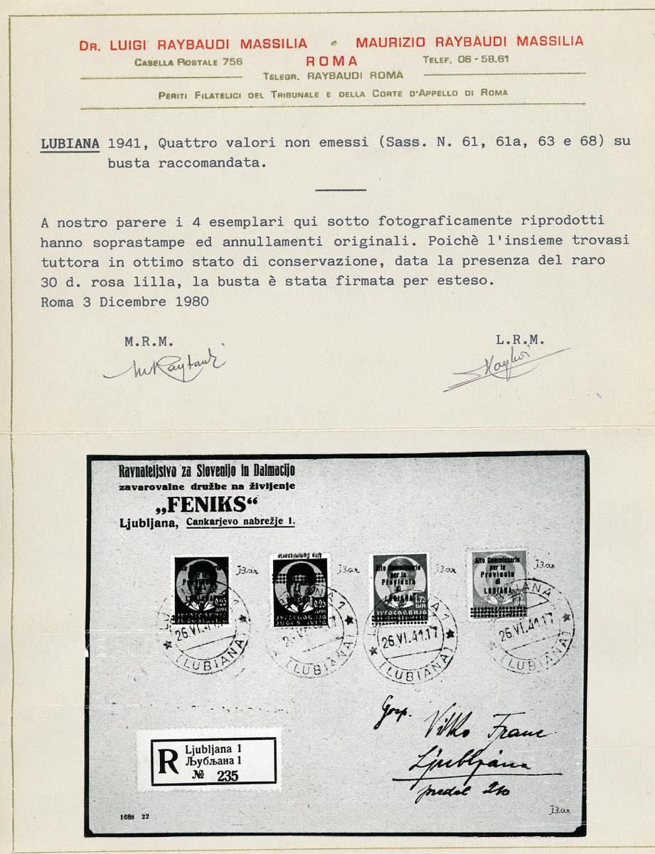 LUBIANA 1941 - Non emessi, 25 p., due esemplari, uno con soprastampa capovolta, 1,75 d., 30 d. (61,61a,63,68), perfetti, su busta raccomandata da Lubiana 26/4/1941 per città. Grande rarità del settroe, si conosce solo un'altra busta simile. Bar, cert. Raybaudi e Ferrario.