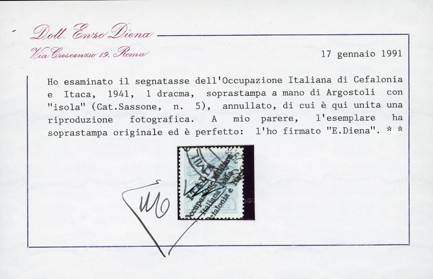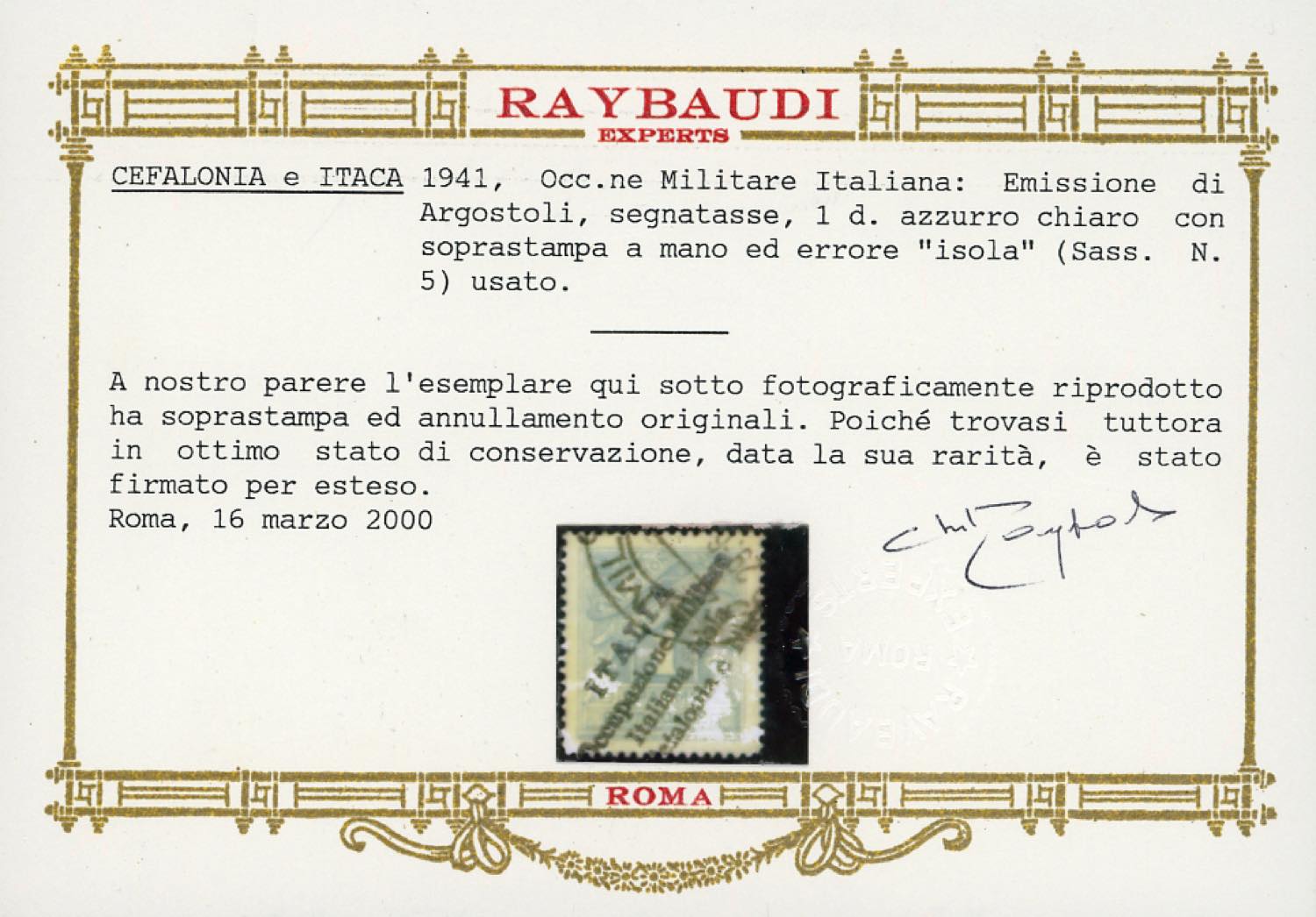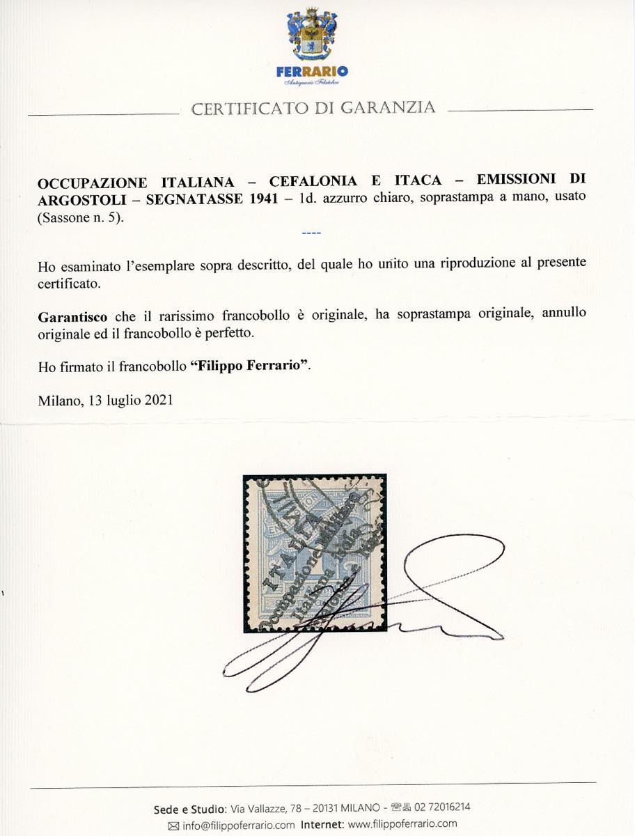 EMISSIONI DI ARGOSTOLI SEGNATASSE 1941 - 1 d., soprastampa a mano (5), usato, perfetto. Rarissimo. Cert. Oro Raybaudi, E.Diena e Ferrario.