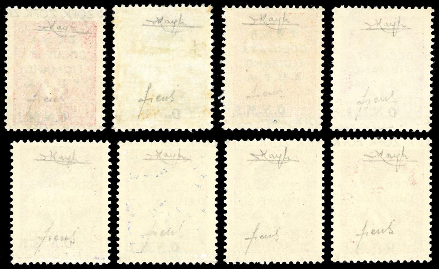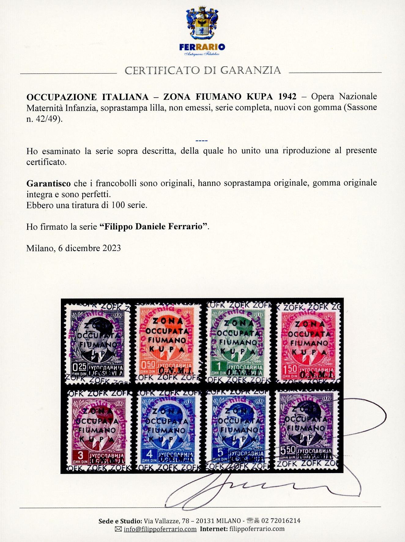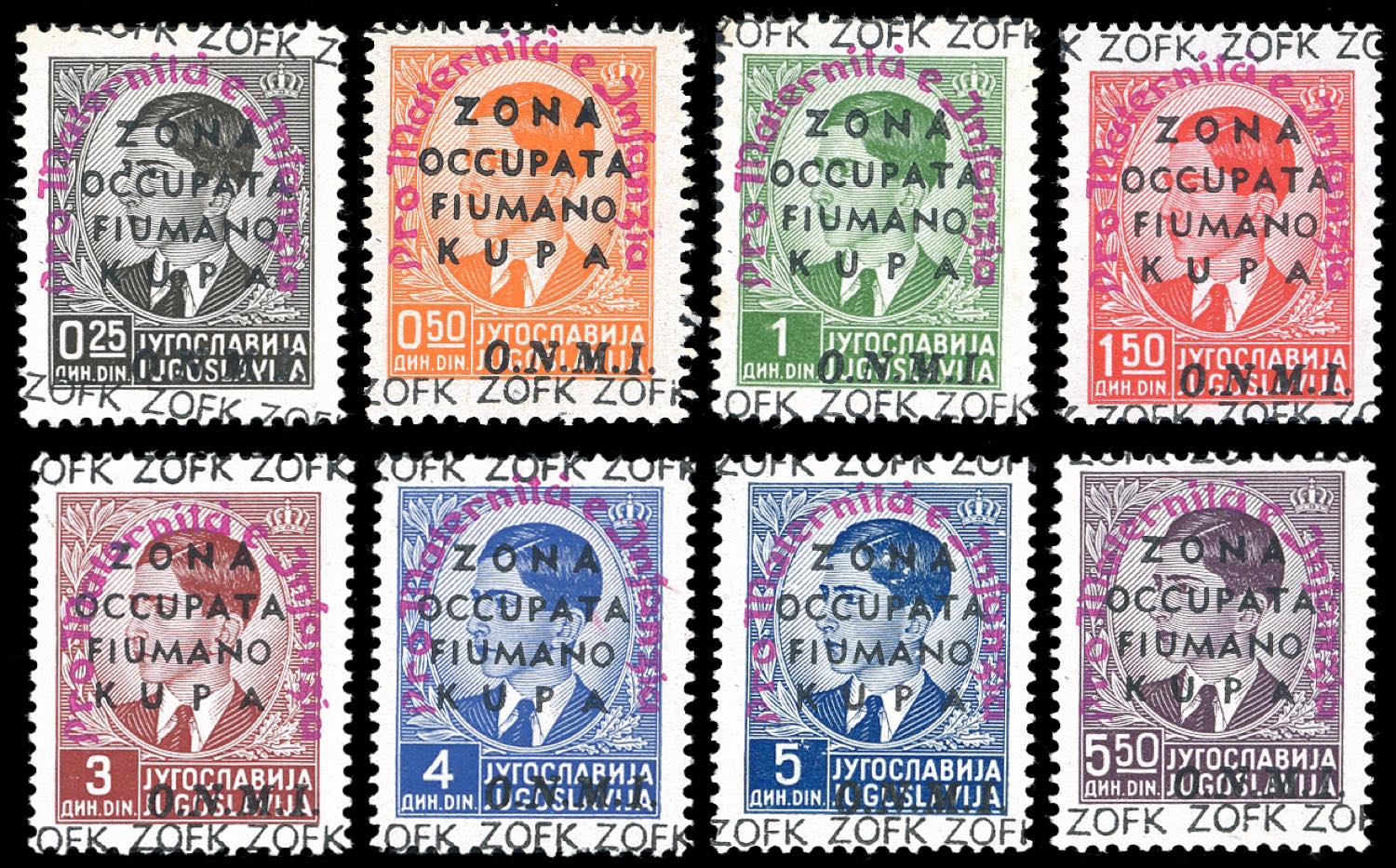 ZONA FIUMANO KUPA 1942 - Opera Nazionale Maternità Infanzia, soprastampa lilla, non emessi, serie completa (42/49), gomma originale integra, perfetti. Ottima qualità, molto rari, tiratura 100 serie. Raybaudi, Fiecchi, cert. Ferrario.