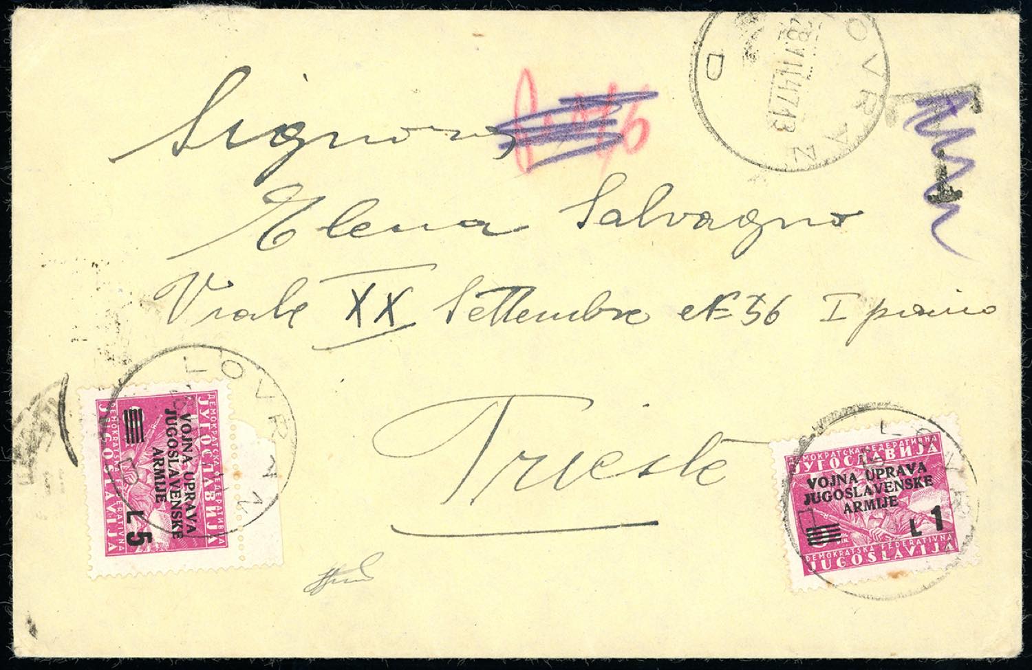 LITORALE SLOVENO AMMINISTRAZIONE MILITARE JUGOSLAVA 1947 - 1 lira su 9 d., 5 lire su 9 d. (67/69), perfetti, su busta da Laurana/Lovran 28/7/1947 a Trieste. Ferrario.