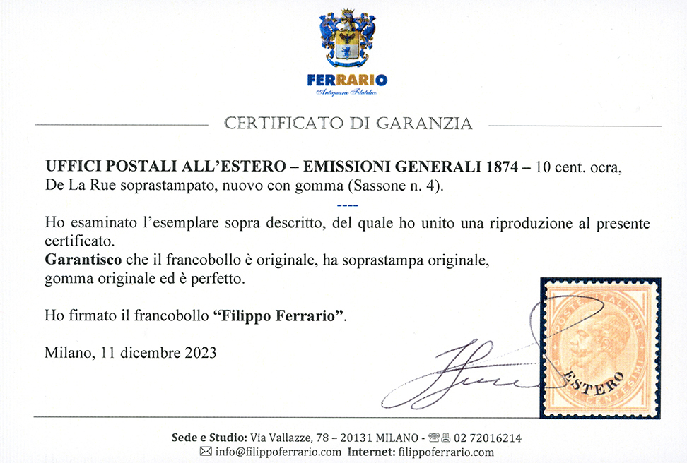 EMISSIONI GENERALI 1871 - 10 cent. De La Rue soprastampato (4), gomma originale, impercettibile traccia di linguella, perfetto. A.Diena, cert. Ferrario.