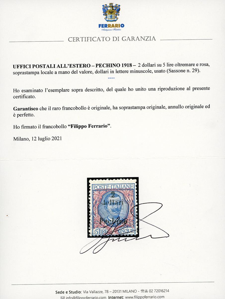 PECHINO 1918 - 2 dollari su 5 lire (29), usato, perfetto. Raro e di ottima qualità. A.Diena, cert. Diena e Ferrario.