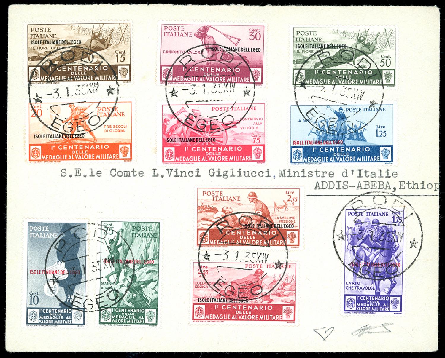 1934 - Medaglie, posta ordinaria, serie completa (80/90), perfetti, su busta viaggiata da Rodi 3/1/1935 ad Addis Abeba, bollo d'arrivo al verso. Molto bella e rara. E.Diena, cert. Ferrario.