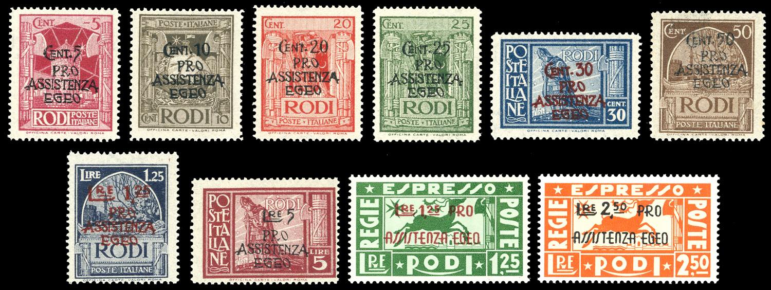 OCCUPAZIONE TEDESCA EGEO 1944 - Soprastampati "Pro Assistenza Egeo", serie completa (118/125+E), nuovi, gomma originale integra, perfetti. Ottima qualità. Alti valori cert. Ferrario.