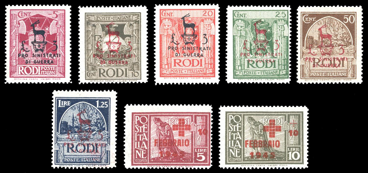OCCUPAZIONE TEDESCA EGEO 1944 - Pro sinistrati di guerra, serie completa (126/131), Croce Rossa (132/133), nuovi, gomma originale integra, perfetti. Ottima qualità.
