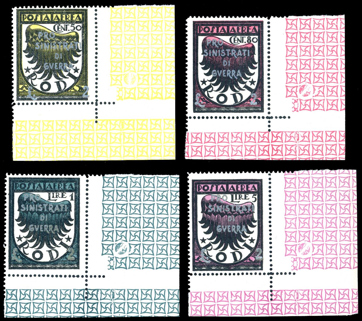 OCCUPAZIONE EGEO POSTA AEREA 1944 - Pro sinistrati di guerra, soprastampati (A56/A59), nuovi, angolo di foglio, gomma originale integra, perfetti. Splendidi. Ferrario.