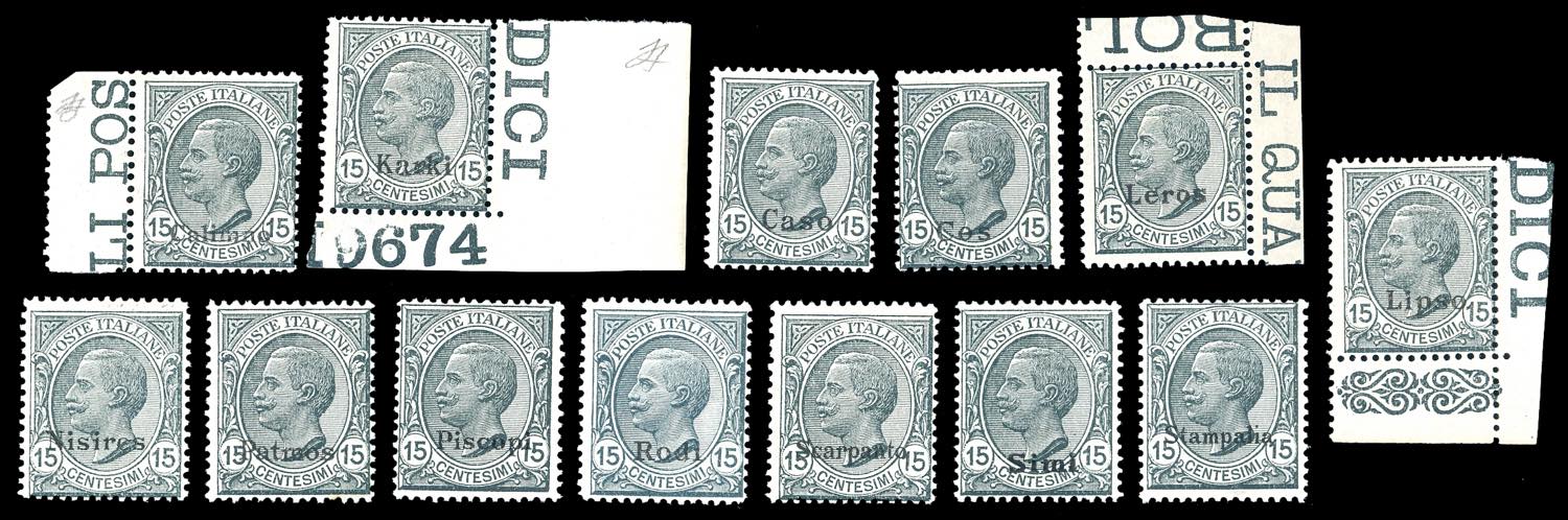 1921 GIRO COMPLETO DELLE 13 ISOLE - 15 cent. Leoni soprastampato, tutte le emissioni delle 13 isole, nuovi, gomma originale integra, ... Leggi tutto