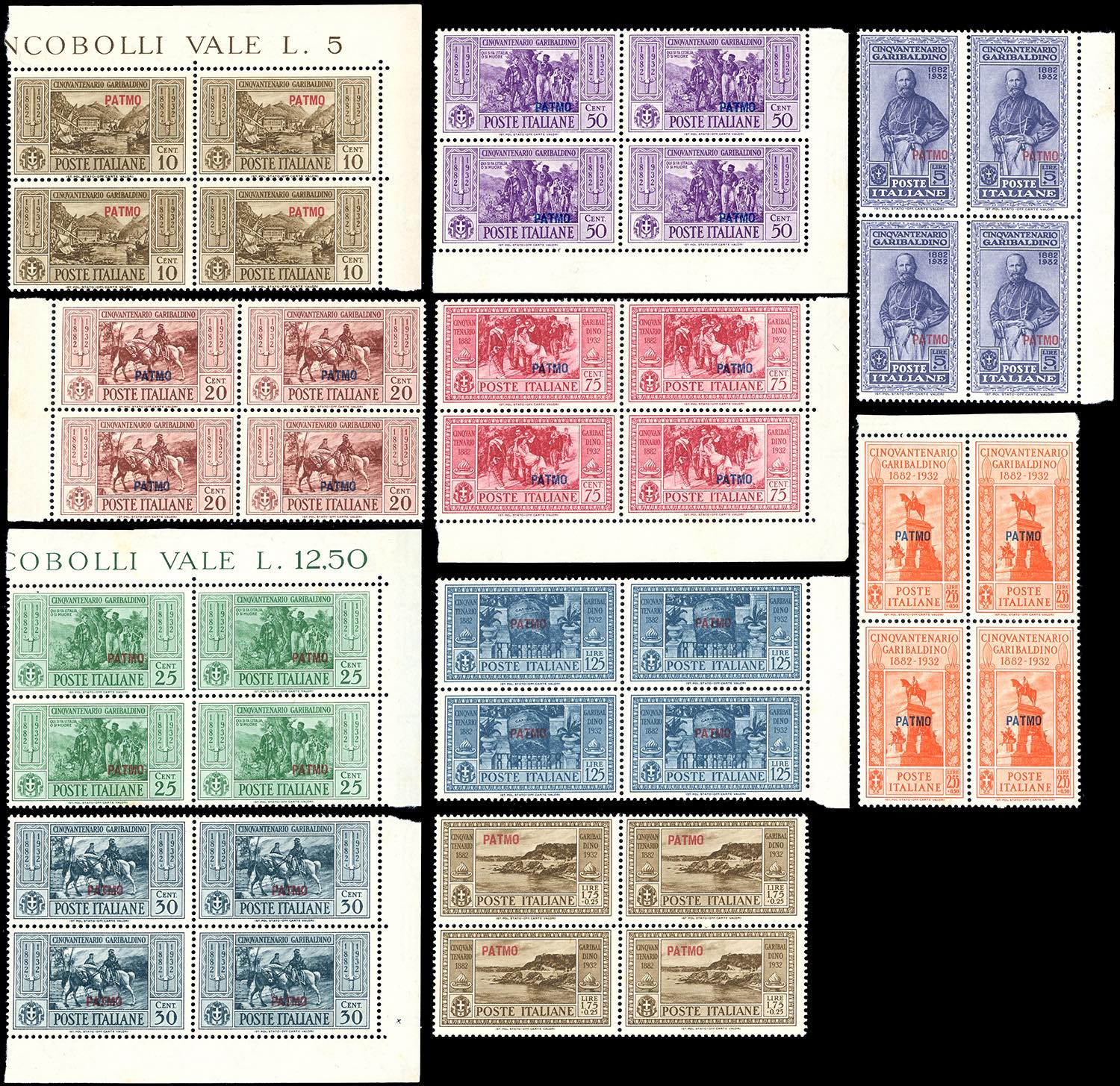PATMO 1932 - Garibaldi, serie completa (17/26), blocchi di quattro, angolo/bordo di foglio, gomma originale integra, perfetti, ottima qualità. Cert. Ferrario.
