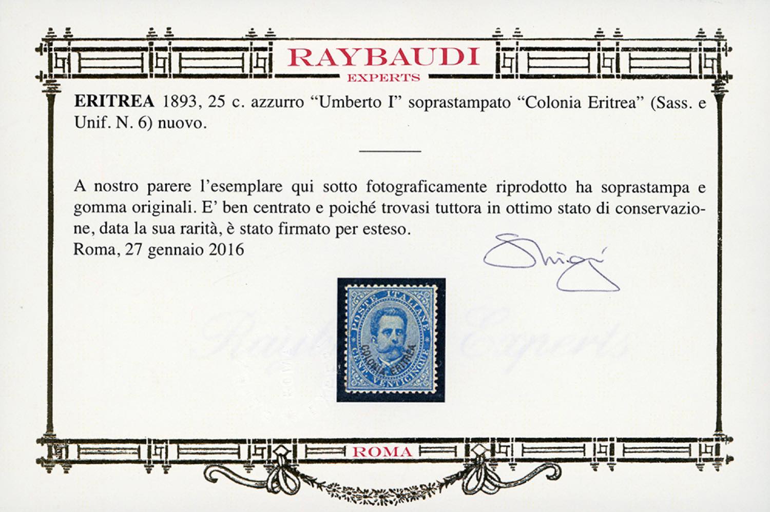 1893 - 25 cent. Umberto soprastampato (6), nuovo, gomma originale, linguella leggera, perfetto. Cert. Oro Raybaudi.