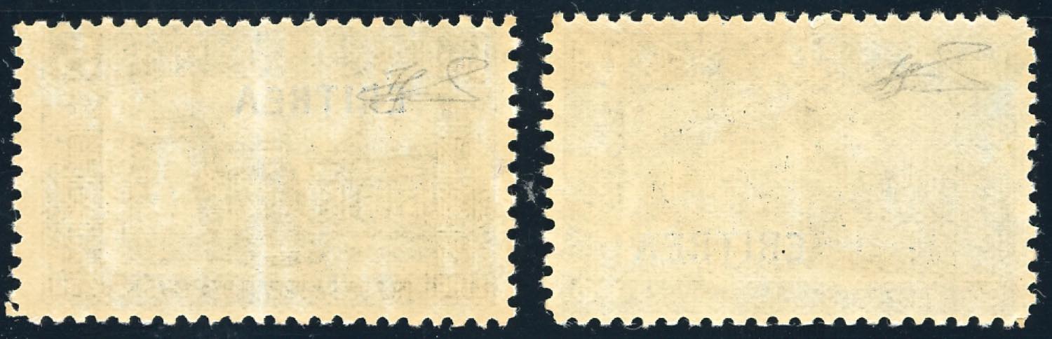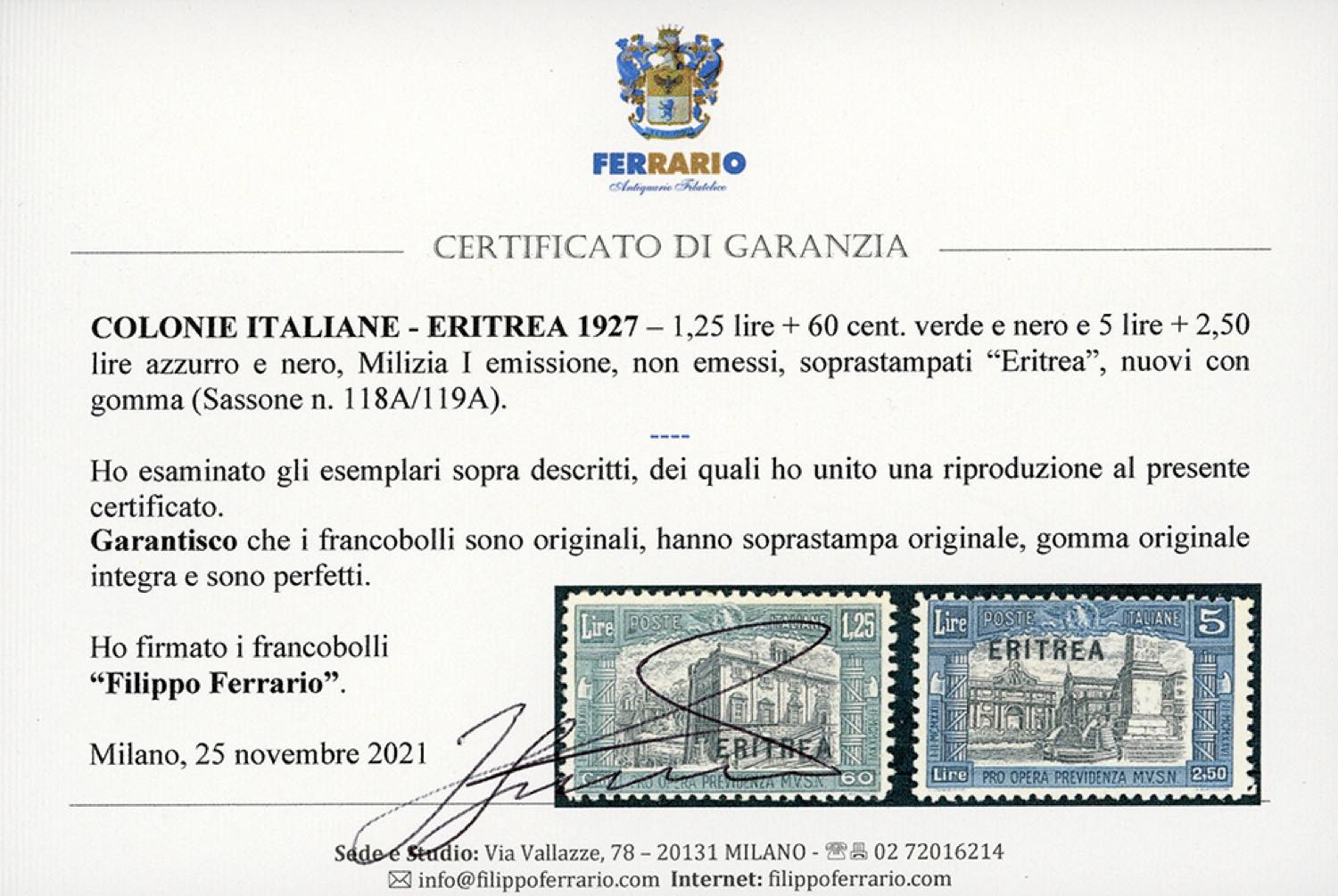 1927 - 1,25 lire su 60 cent. e 5 + 2,50 lire Milizia prima emissione, non emessi (118A/119A), gomma originale integra, perfetti. Molto freschi, ottima qualità. Cert. Ferrario.