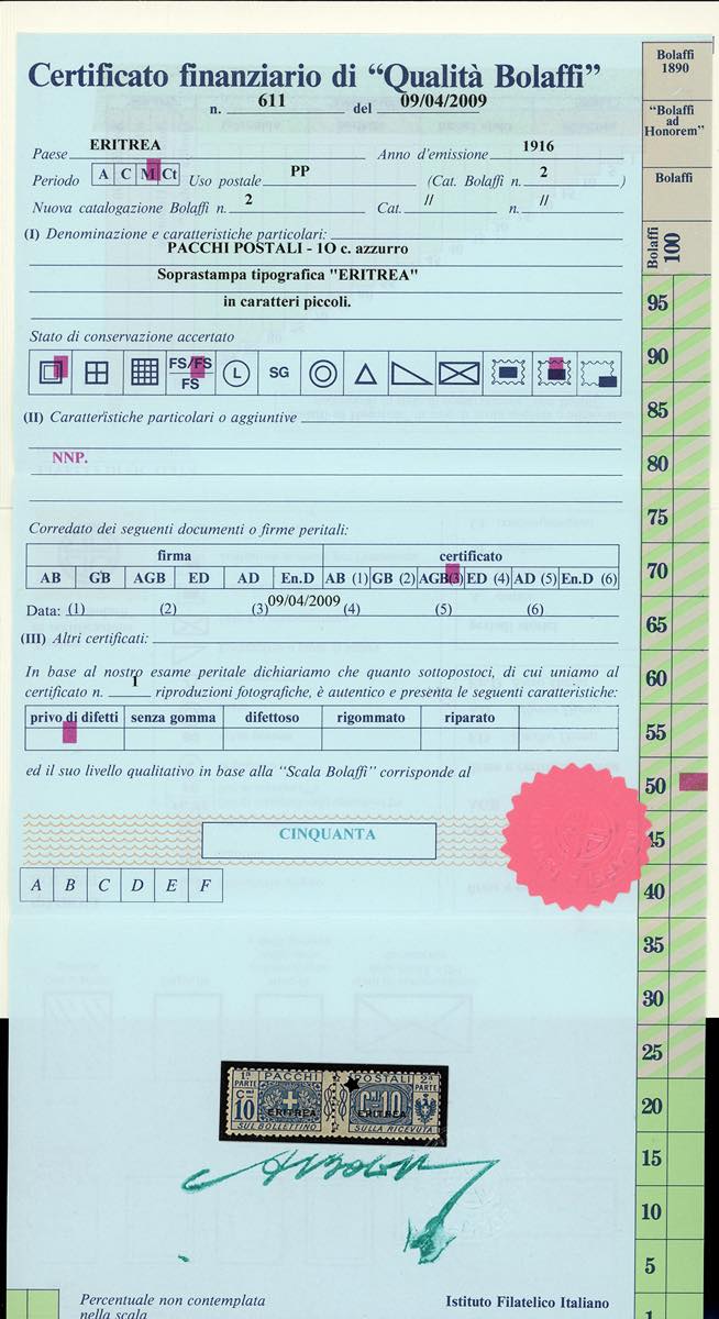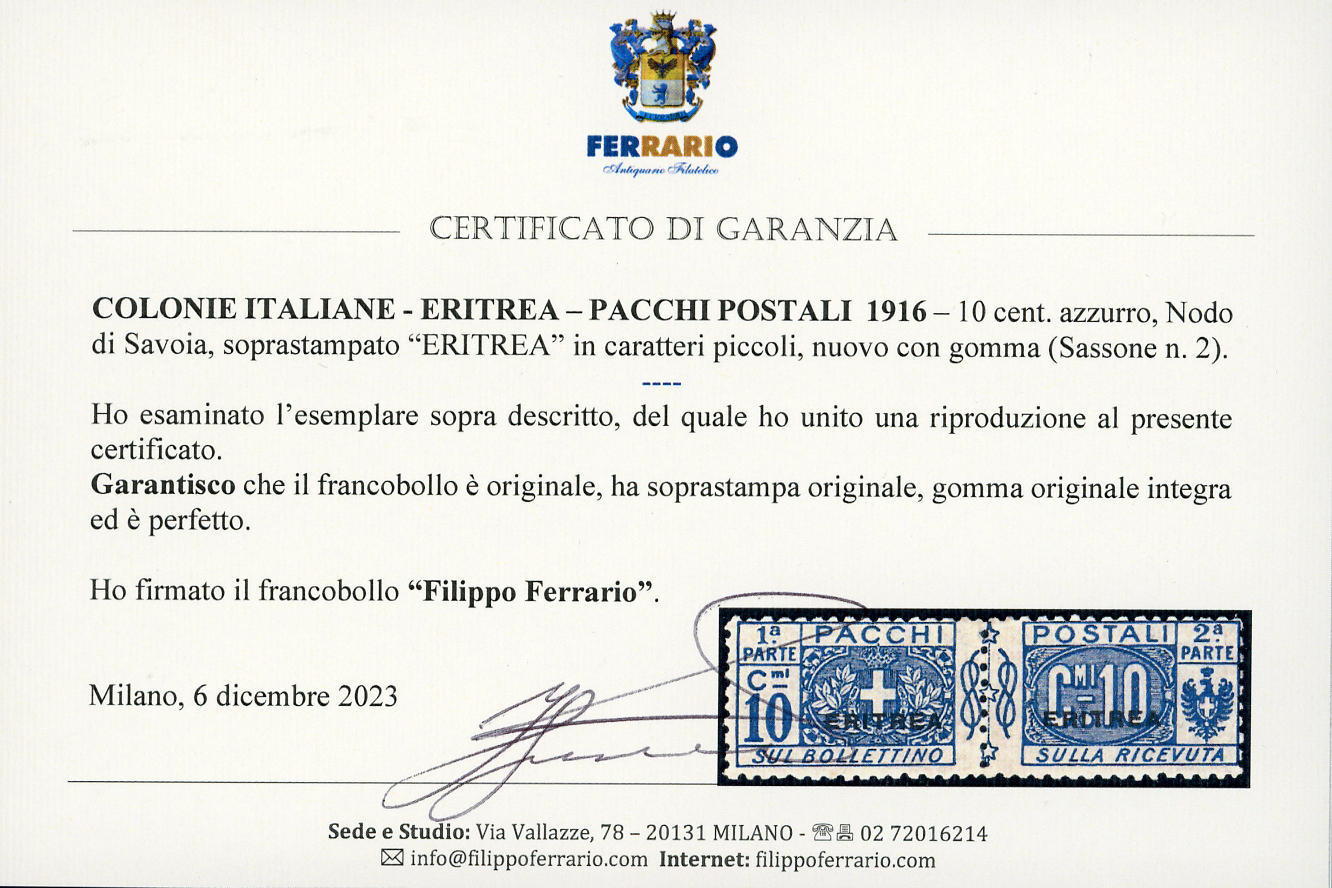 PACCHI POSTALI 1916 - 10 cent. azzurro, soprastampato (2), nuovo, gomma originale integra, perfetto. Molto fresco, raro. Raybaudi, cert. Ferrario e finanziario Bolaffi.