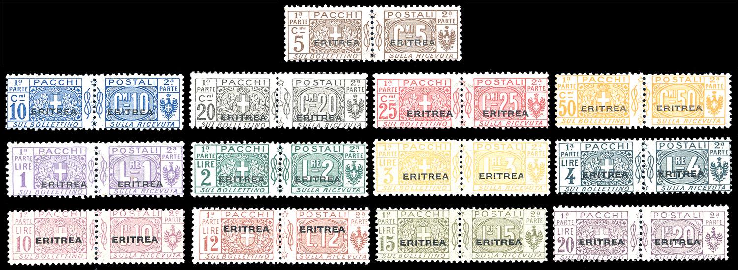 PACCHI POSTALI 1917/1924 - Soprastampa più grande, serie completa (9/21), nuovi, gomma originale integra, perfetti. Ottima qualità. Cert. Raybaudi.