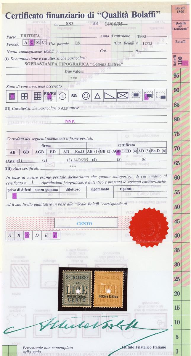 SEGNATASSE 1903 - 50 e 100 lire soprastampati (12/13), nuovi, gomma originale integra, perfetti, buona/ottima centratura. Bellissimi. Certificato finanziario Bolaffi 100%.