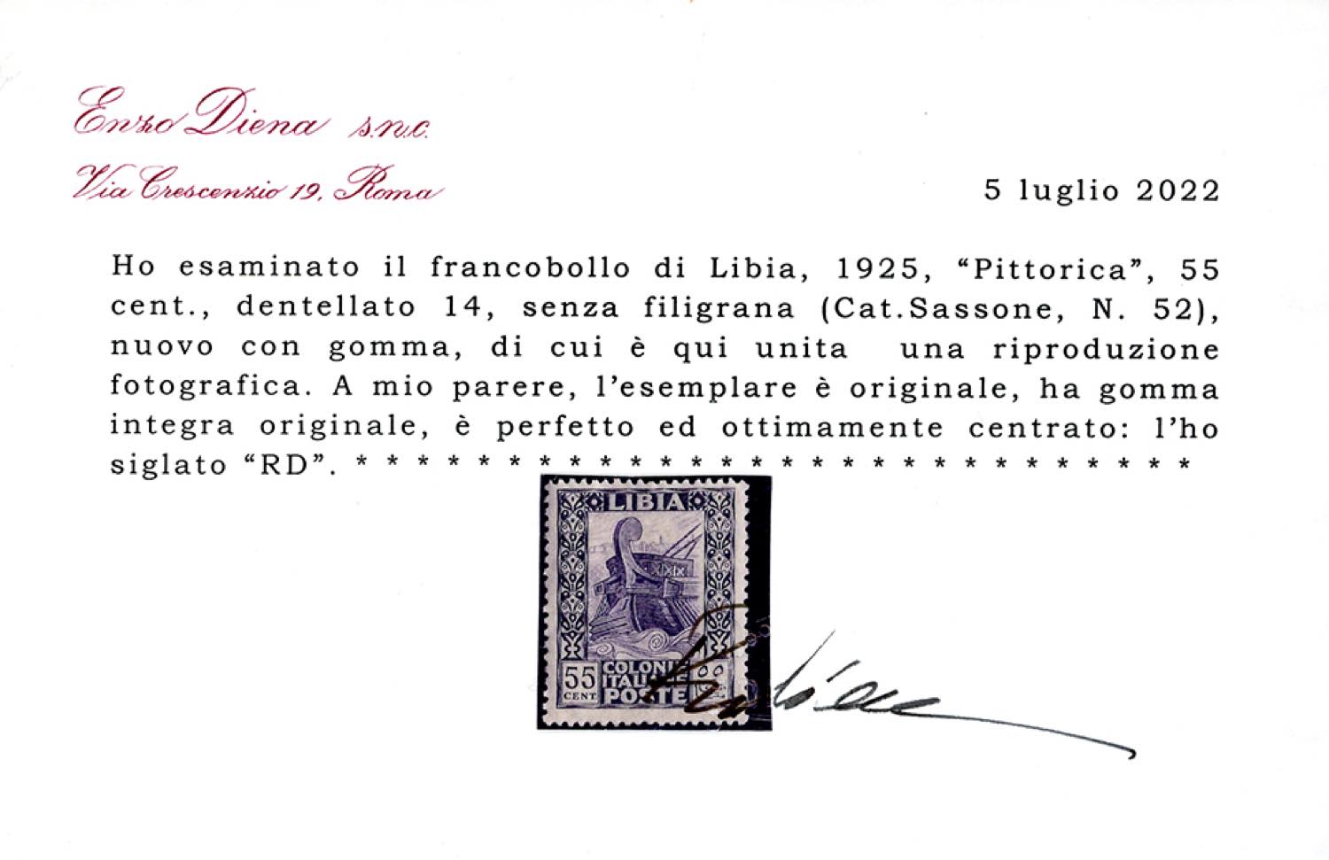 1925 - 55 cent. Pittorica, dent. 14, senza filigrana (52), ben centrato, gomma originale integra, perfetto e molto fresco. Cert. Diena.
