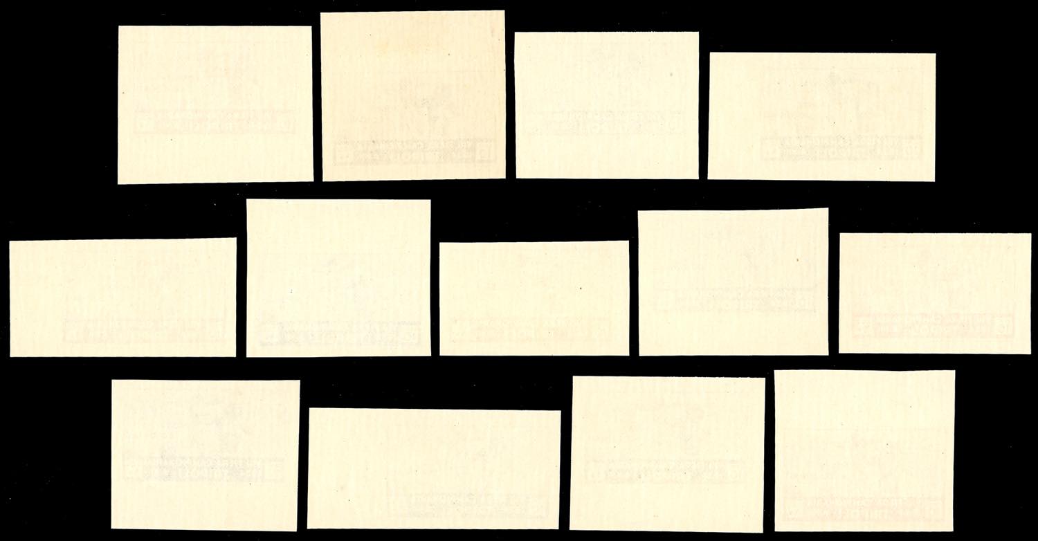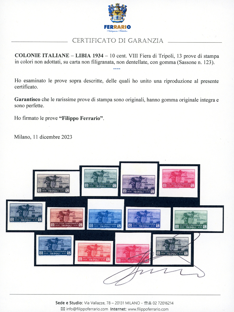 1934 - 10 cent. VIII Fiera di Tripoli (125), 13 prove di stampa in colori non adottati, su carta non filigranata, non dentellate, quasi tutte bordo di foglio, gomma originale integra, perfette e di ottima qualità. Insieme splendido ed inedito, di eccezionale rarità. Cert. Ferrario.