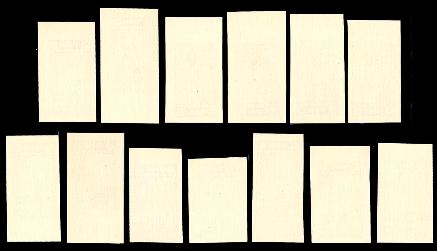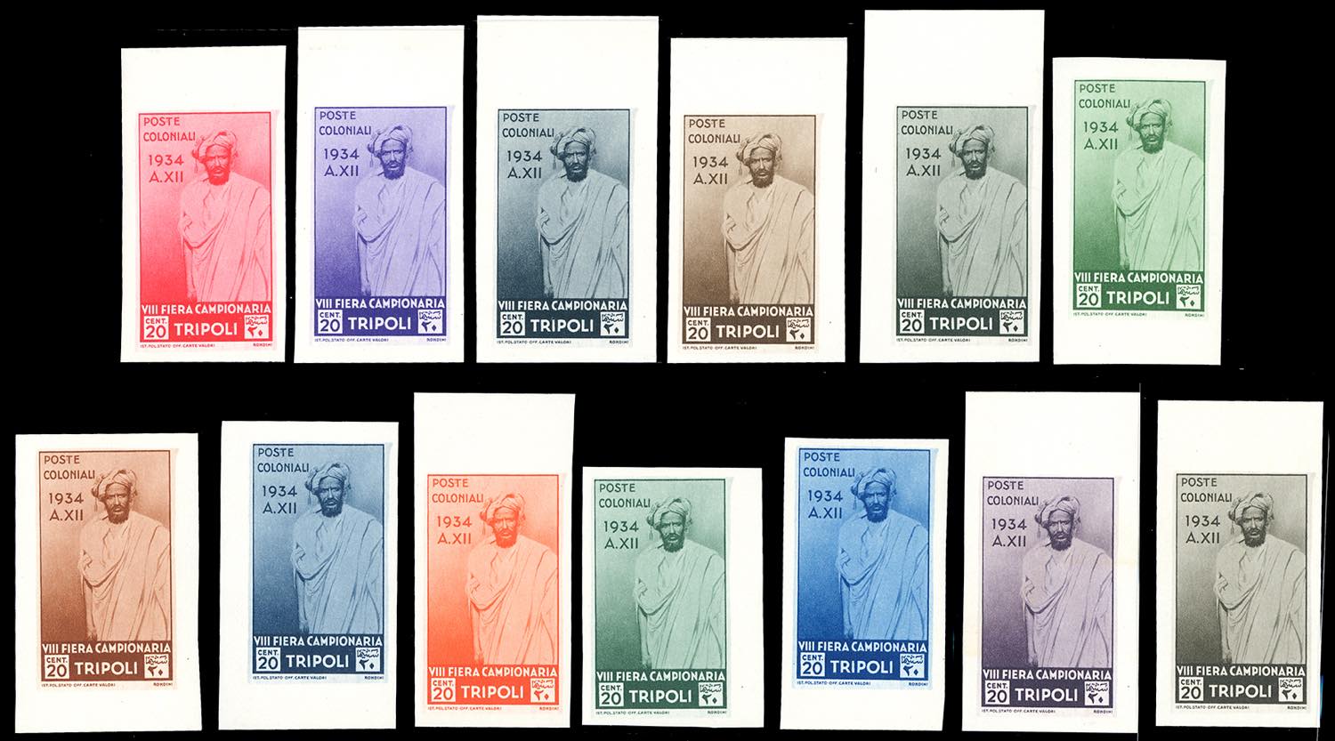 1934 - 20 cent. VIII Fiera di Tripoli (126), 13 prove di stampa in colori non adottati, su carta non filigranata, non dentellate, quasi tutte bordo di foglio, gomma originale integra, perfette e di ottima qualità. Insieme spelndido ed inedito, di eccezionale rarità. Cert. Ferrario.