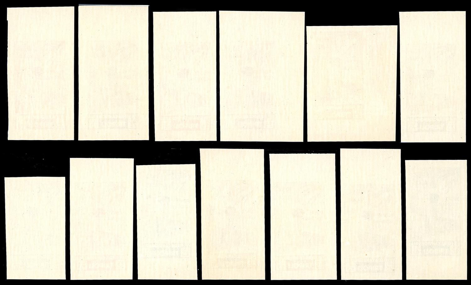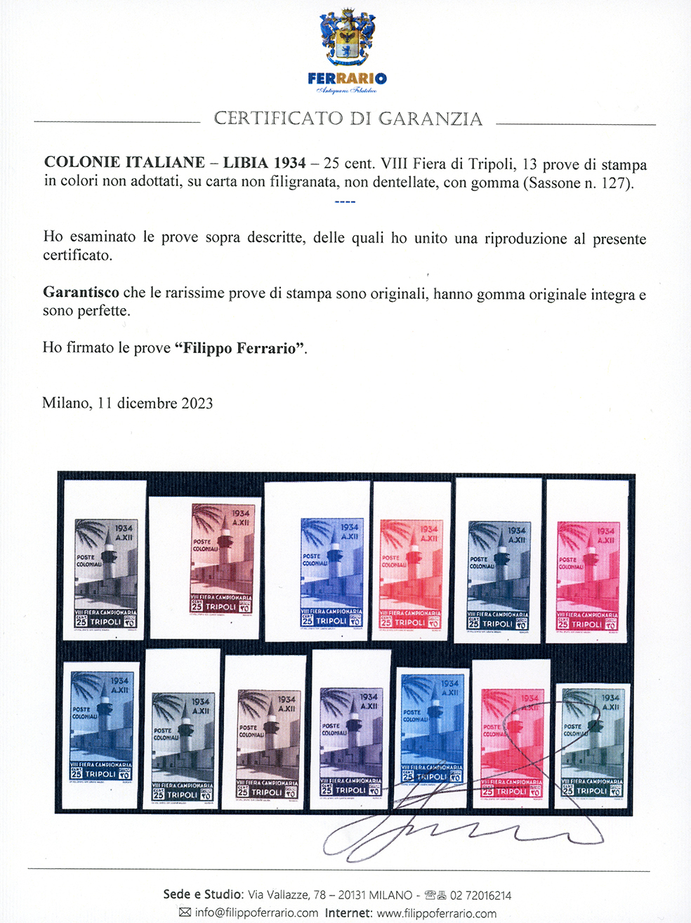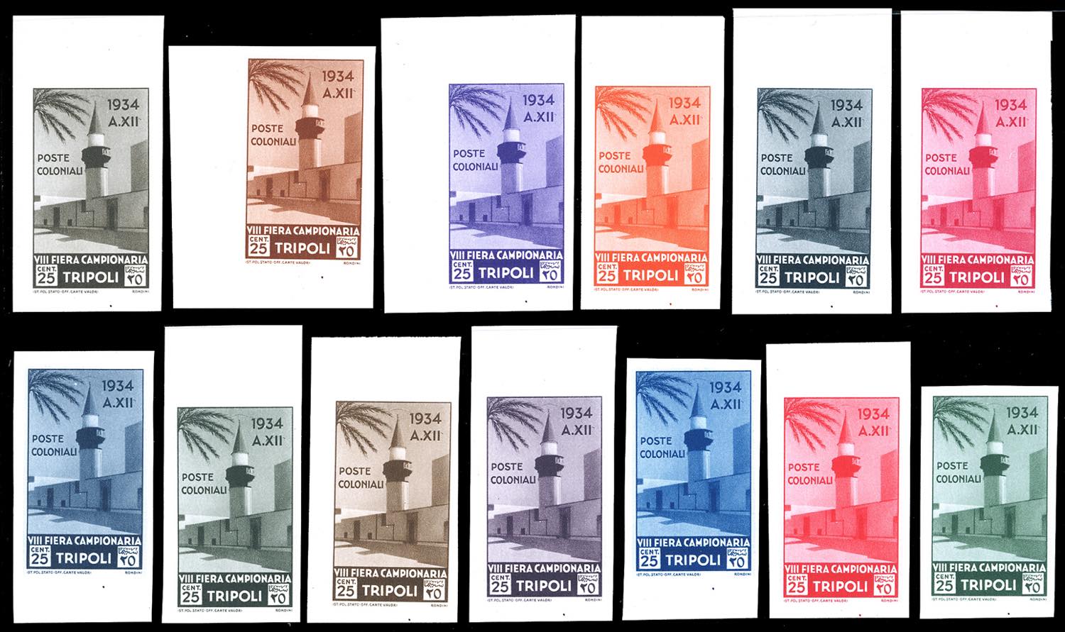 1934 - 25 cent. VIII Fiera di Tripoli (127), 13 prove di stampa in colori non adottati, su carta non filigranata, non dentellate, quasi tutte bordo/angolo di foglio, gomma originale integra, perfetti e di ottima qualità. Insieme splendido ed inedito, di eccezionale rarità. Cert. Ferrario.