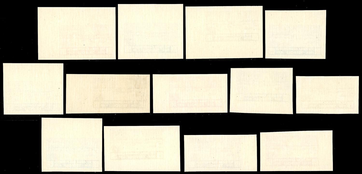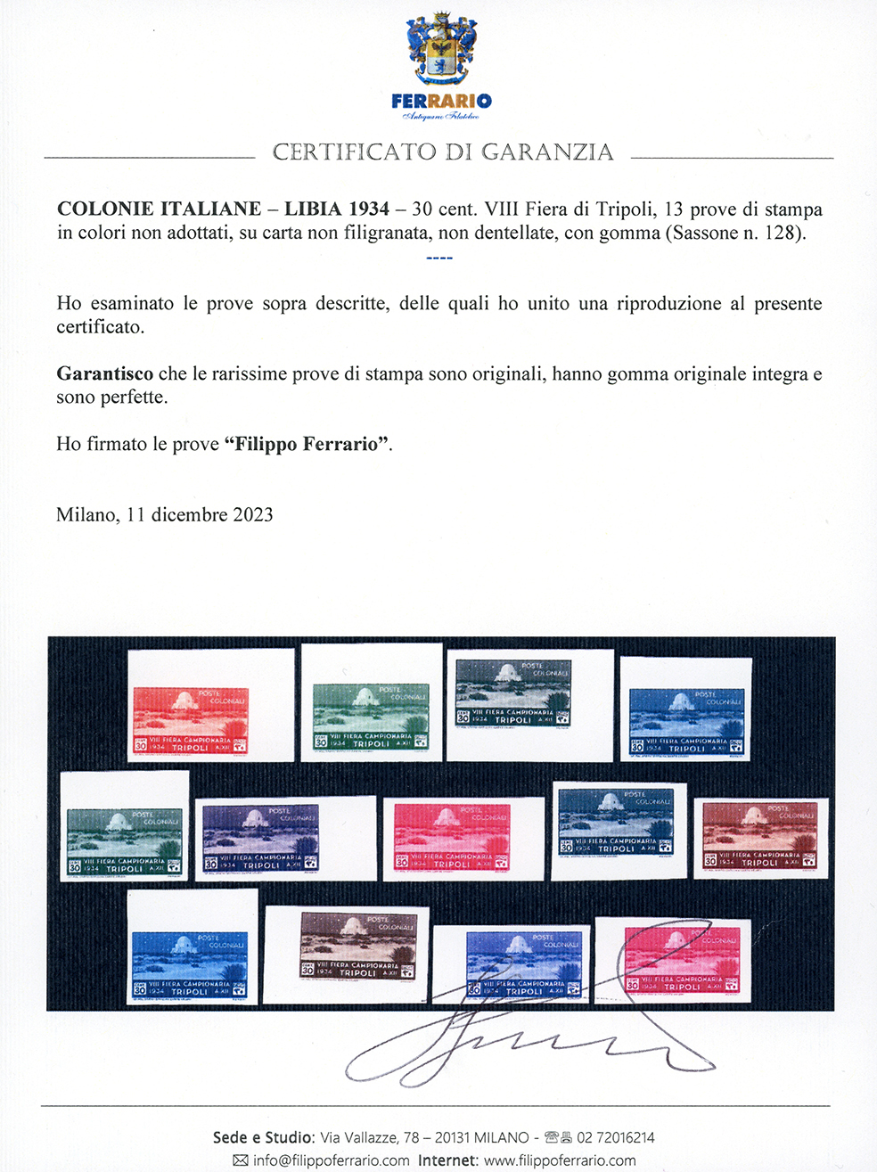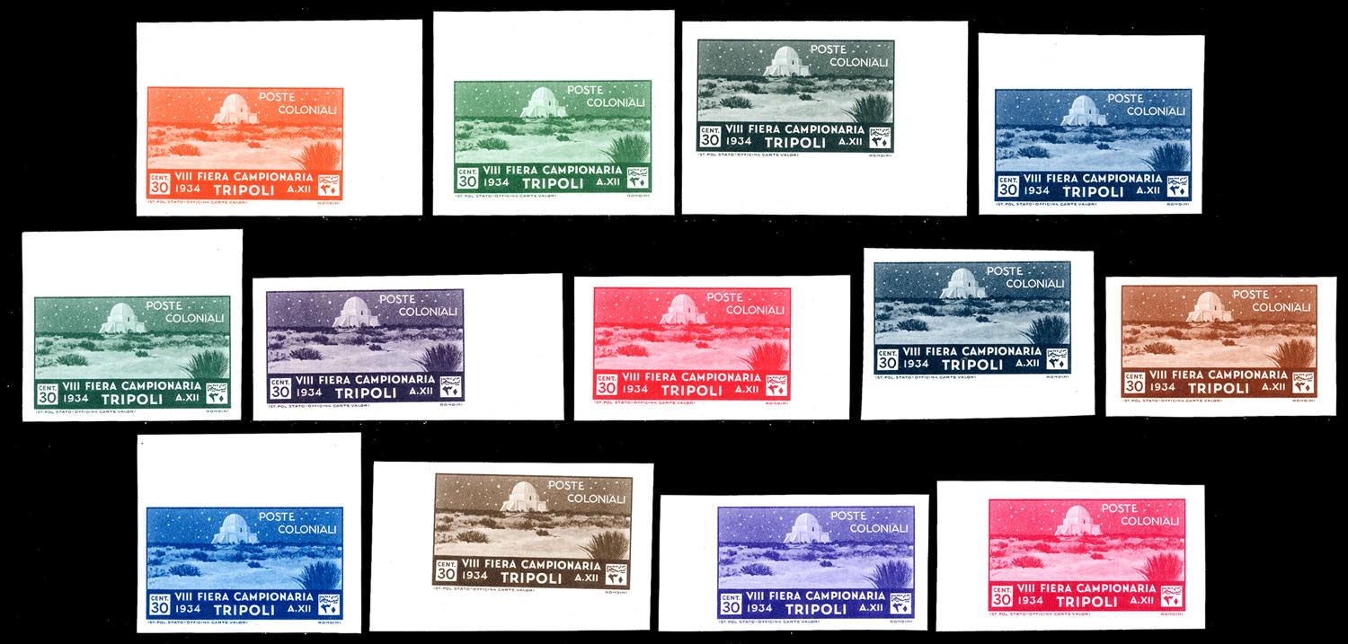 1934 - 30 cent. VIII Fiera di Tripoli (128), 13 prove di stampa in colori non adottati, su carta non filigranata, non dentellate, quasi tutte bordo/angolo di foglio, gomma originale integra, perfette e di ottima qualità. Insieme splendido ed inedito, di eccezionale rarità. Cert. Ferrario.