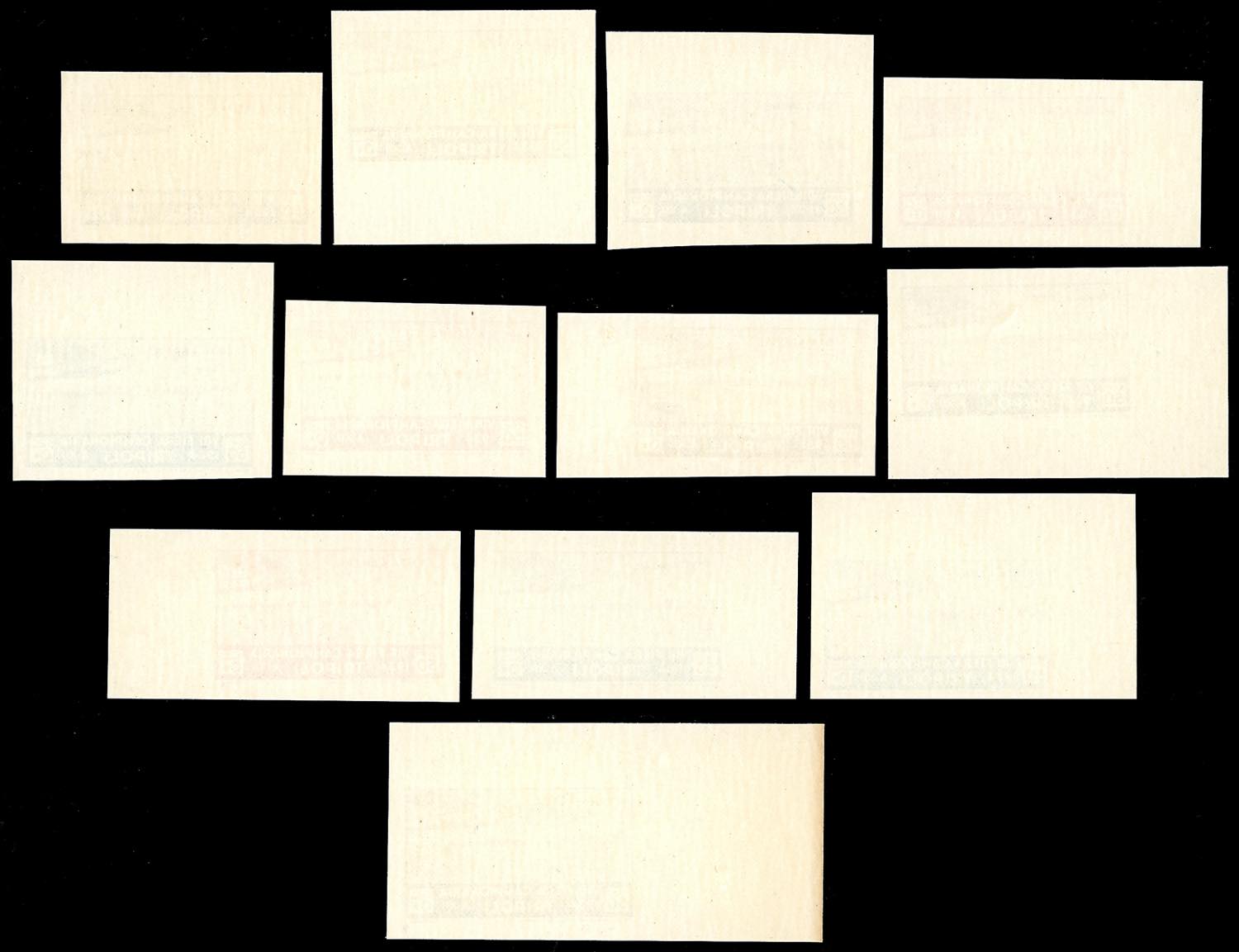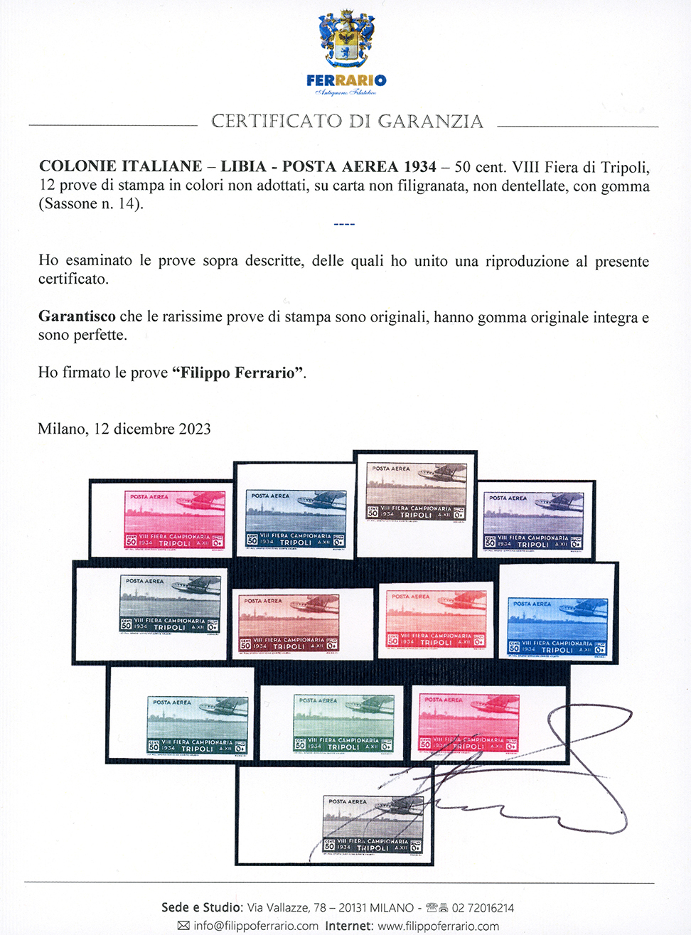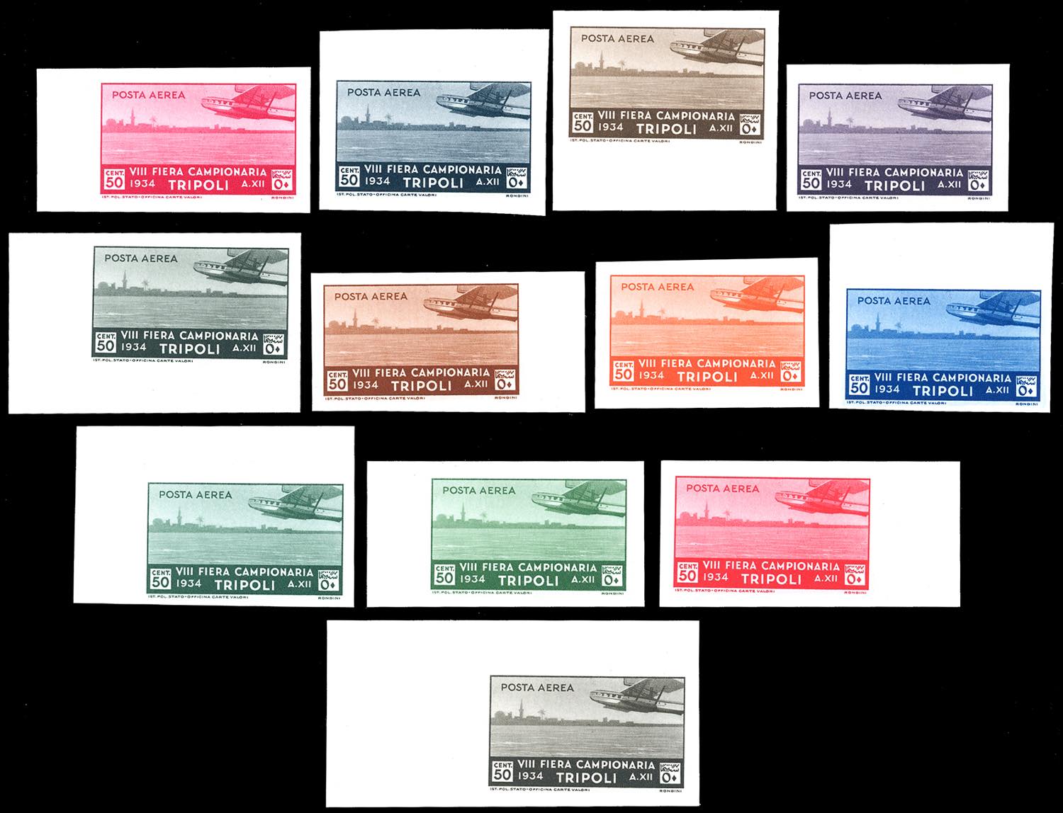 POSTA AEREA 1934 - 50 cent. VIII Fiera di Tripoli (14), 12 prove di stampa in colori non adottati, su carta non filigranata, non dentellate, quasi tutte bordo/angolo di foglio, gomma originale integra, perfette e di ottima qualità. Insieme splendido ed inedito, di eccezionale rarità.