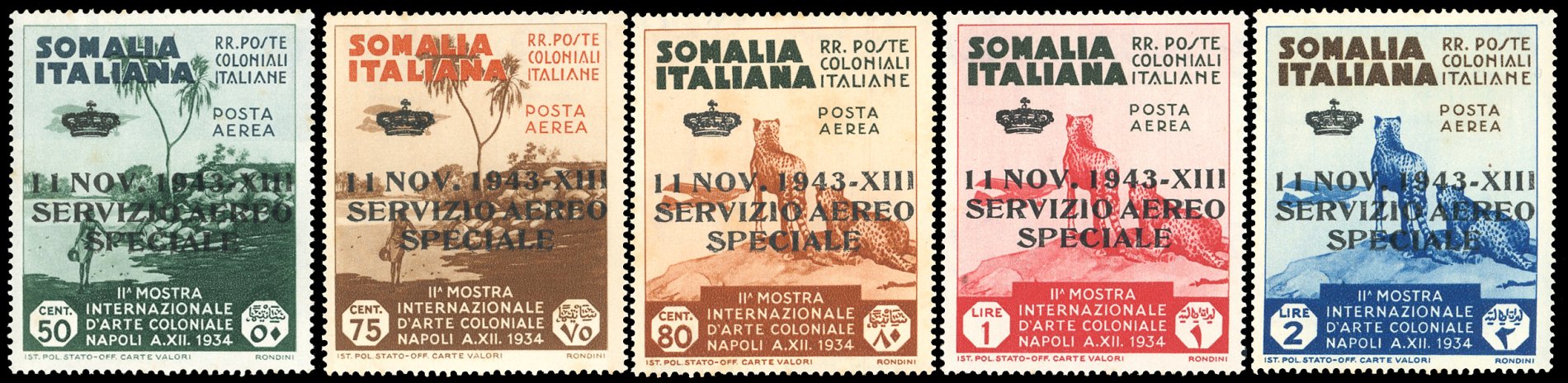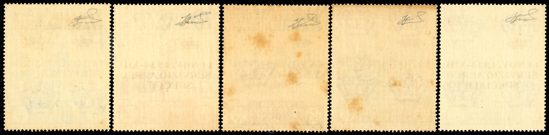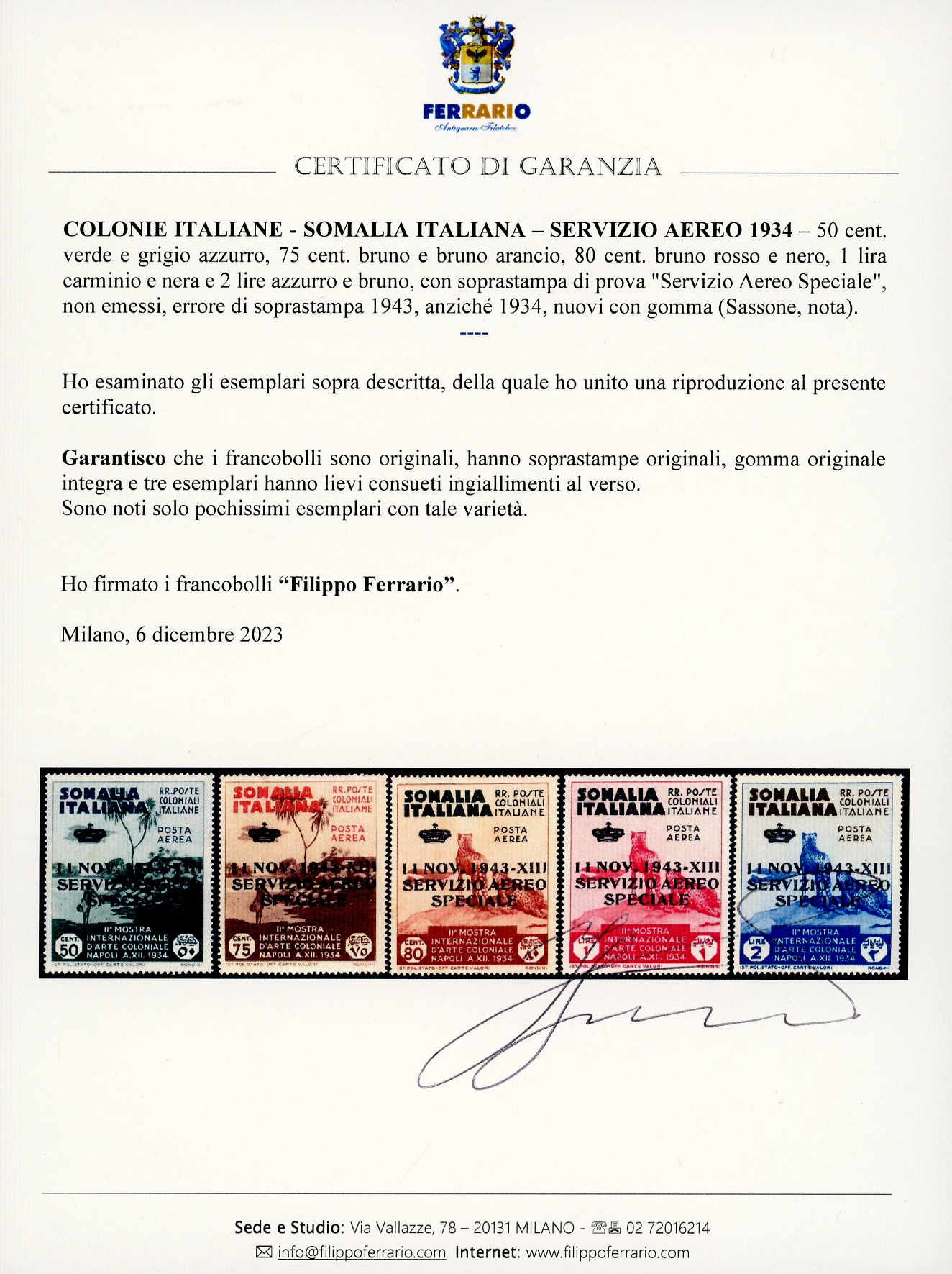 SERVIZIO AEREO 1934 - 50 cent., 75 cent., 80 cent., 1 lira e 2 lire soprastampa di prova "Servizio Aereo Speciale", errore 1943 anziché 1934, serie completa, non emessi (Sassone nota), gomma originale integra, due esemplari con lievi consueti ingiallimenti. Insieme molto raro. Cert. Ferrario.