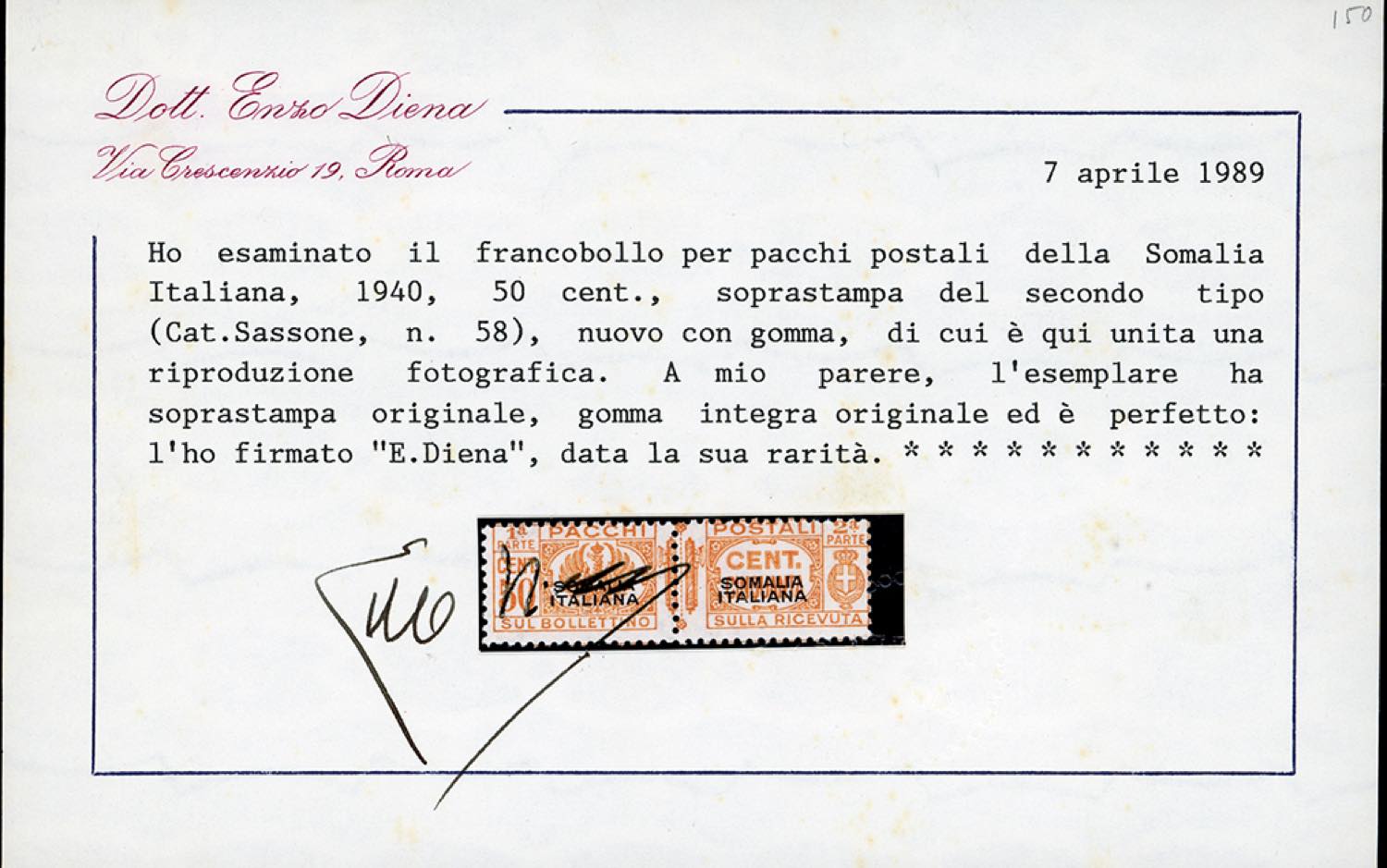 PACCHI POSTALI 1940 - 5 cent. arancio, fasci al centro, soprastampa del I tipo (58), gomma originale integra, perfetto e molto fresco. Raro. A.Diena, cert. E.Diena.