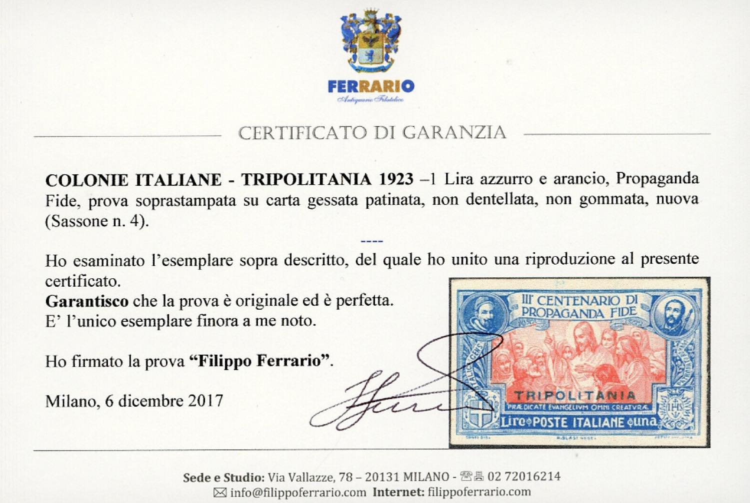 1923 - 1 lira Propaganda Fide, prova soprastampata su carta gessata patinata, non dentellata, non gommata (4), perfetta. Finora non catalogata e probabilmente unica. A.Diena, cert. Ferrario.