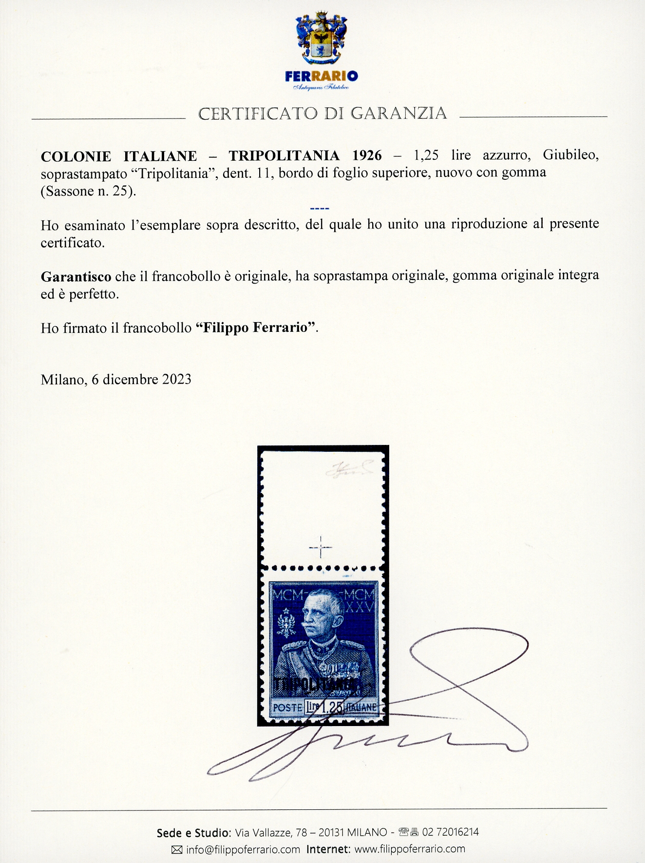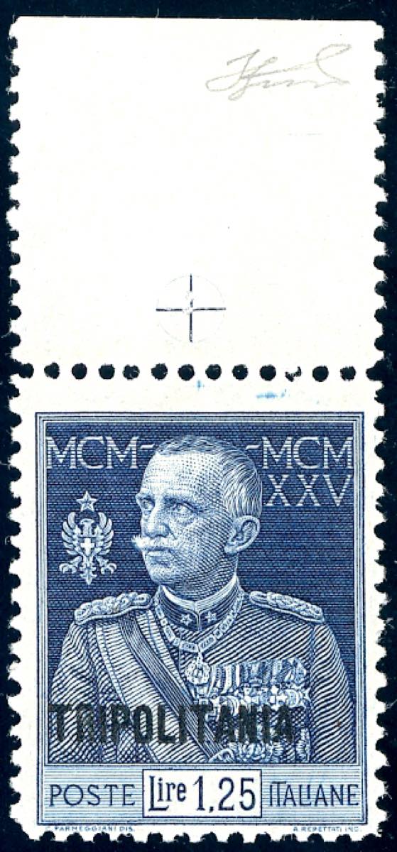 1926 - 1,25 lire azzurro, Giubileo, dent. 11 (25), bordo di foglio, nuovo, gomma originale integra, perfetto. Molto fresco e raro. G.Bolaffi, A.Diena. Cert. Ferrario.
