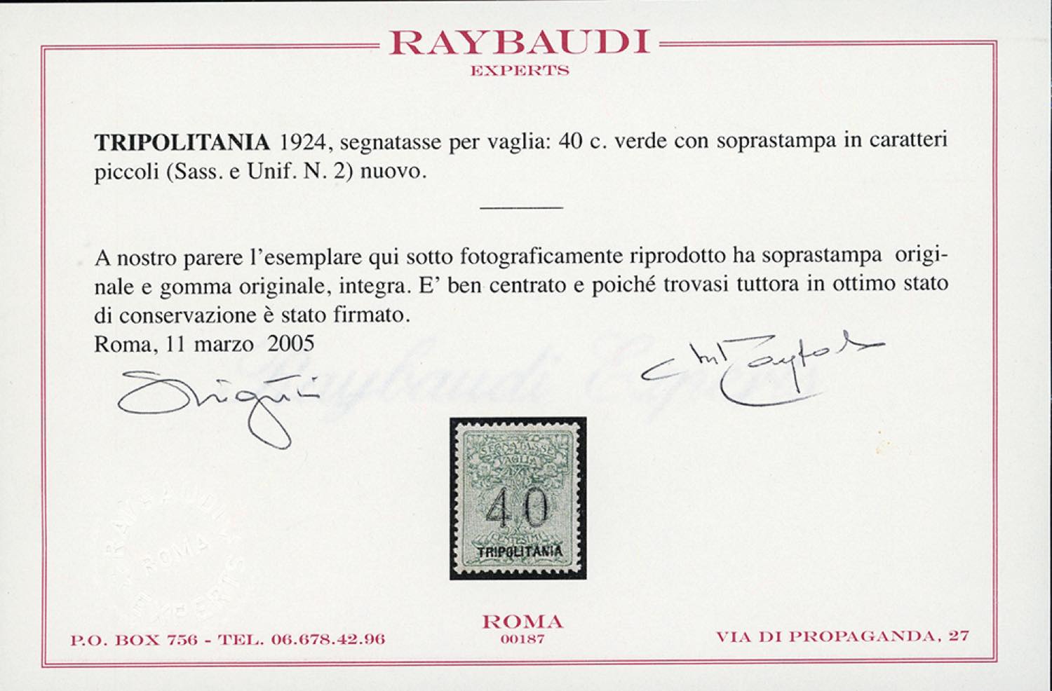 SEGNATASSE PER VAGLIA 1924 - 40 cent. verde, soprastampa in caratteri piccoli (2), nuovo, gomma originale integra, perfetto. Molto fresco e ben centrato. Raro di questa qualità. A.Diena, Ferrario, cert. Raybaudi.