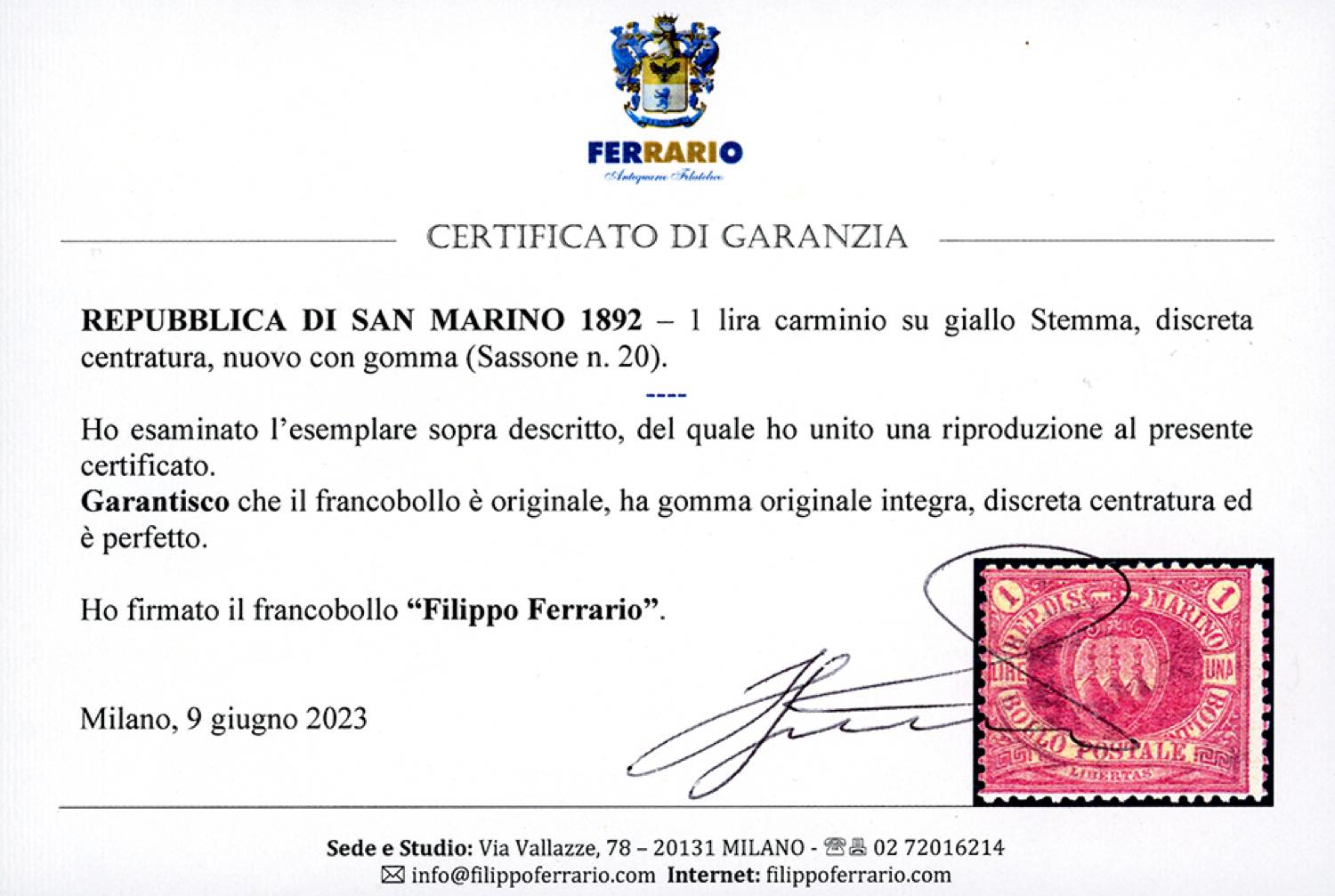 1892 - 1 lira carminio su giallo Stemma (20), discreta centratura, gomma originale integra, perfetto. Cert. Ferrario.