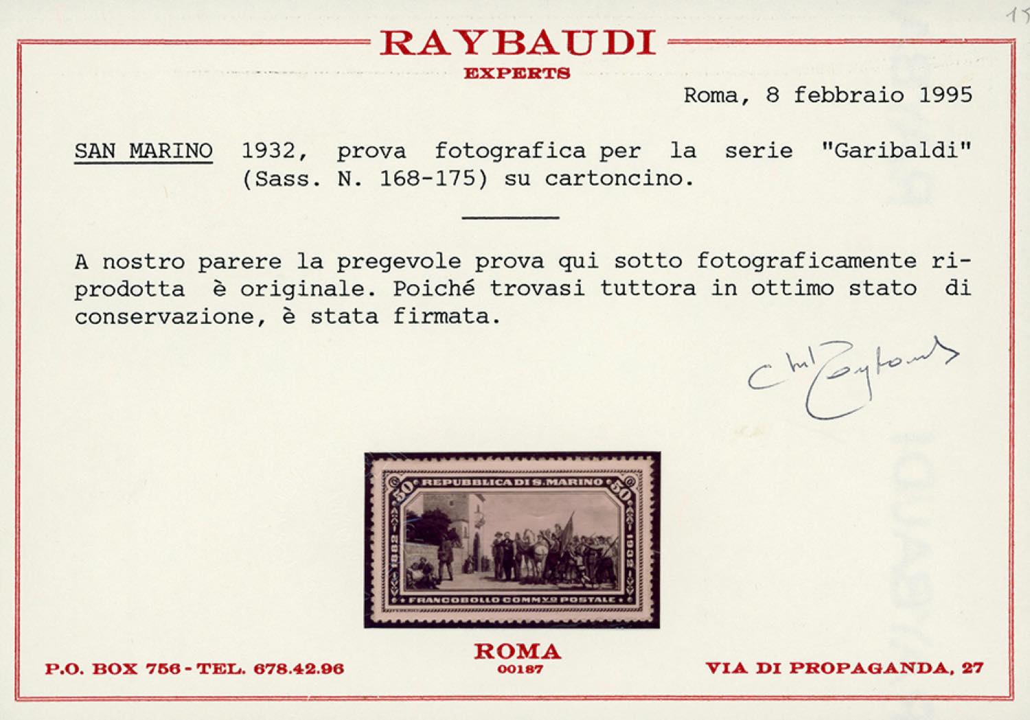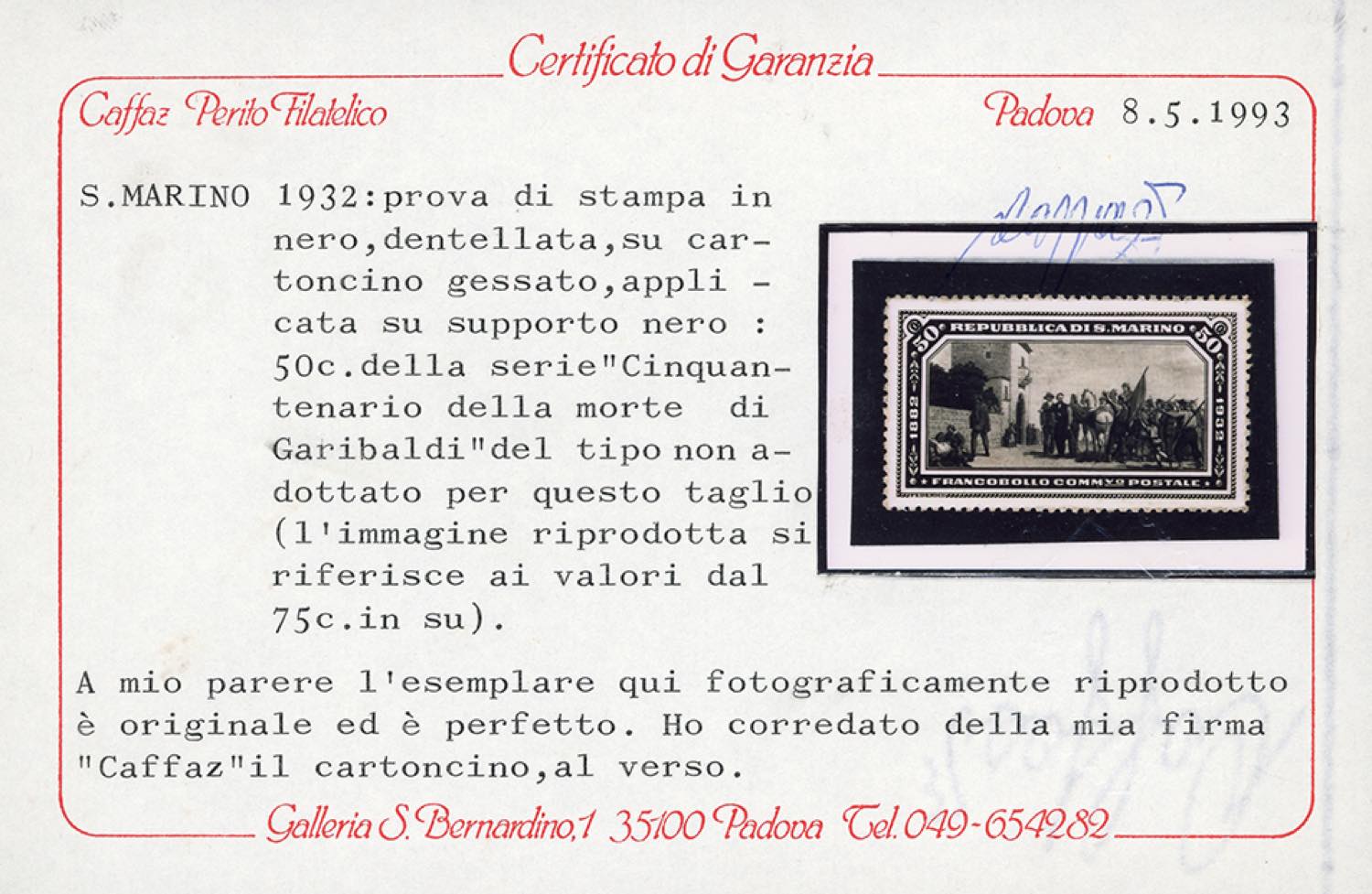 1932 - 50 cent. Garibaldi (171), prova fotografica di E.Federici in nero, dentellata, applicata su cartoncino nero, con soggetto non adottato per questo valore (l'immagine è stata utilizzata per il francobollo da 75 cent. e successivi dell'emissione definitiva), senza gomma, perfetta. Molto rara. Cert. Caffaz e Raybaudi.