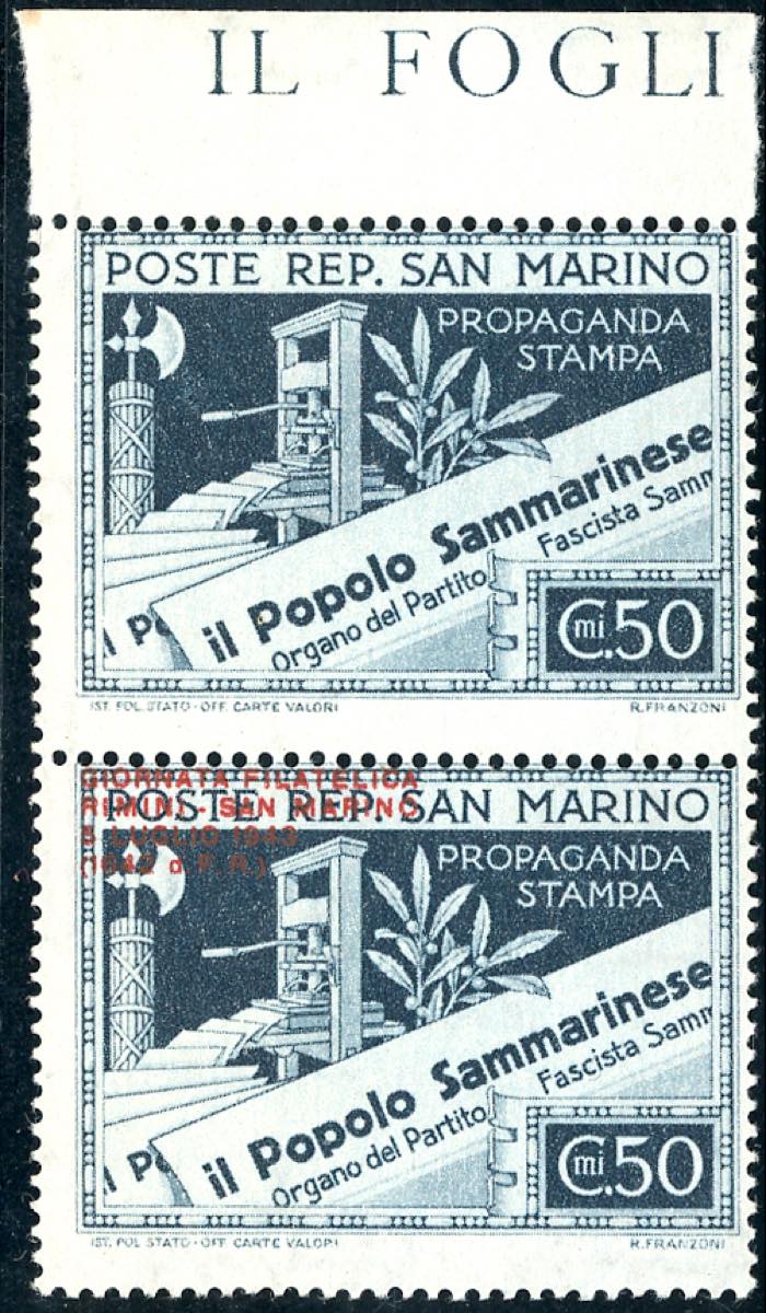 Lotto 2085 - 1943 - 50 cent. Giornata Filatelica, coppia verticale, un ...